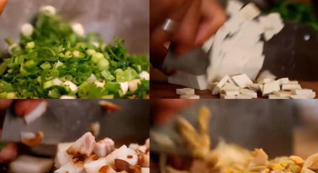 湯分為葷湯和清湯兩種,葷湯加臊子,清湯不加。清湯的做法:將白蘿卜、紅蘿卜、豆腐、土豆、番瓜、黃花菜、少許木耳切丁,其中白蘿卜丁、紅蘿卜丁用開水提前掠熟。炒制過程中加入大量辣椒面、胡椒粉、少許花椒粉、鹽,加水成湯。口味偏重一點(diǎn)好。