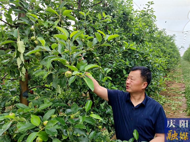 ▲慶陽市氣象局工作人員查看蘋果長勢。