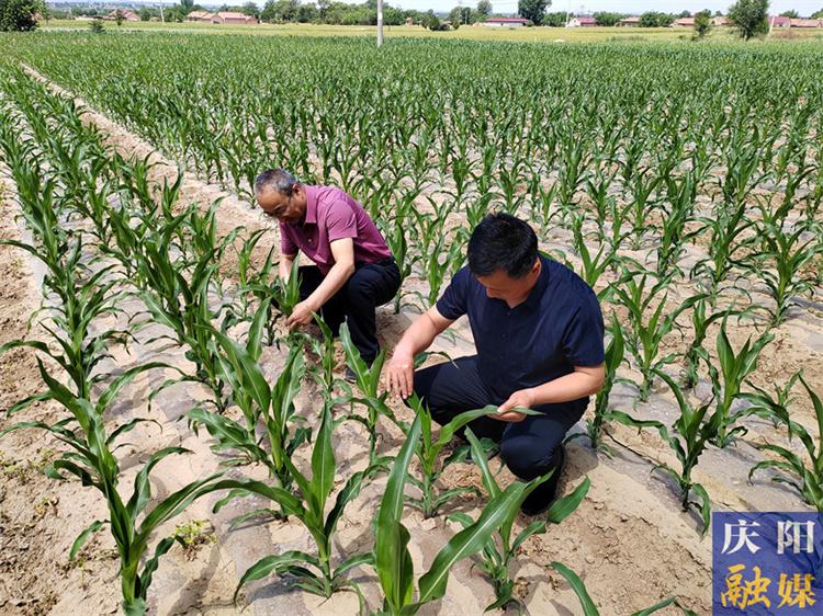 ▲慶陽市氣象局工作人員查看玉米苗情。