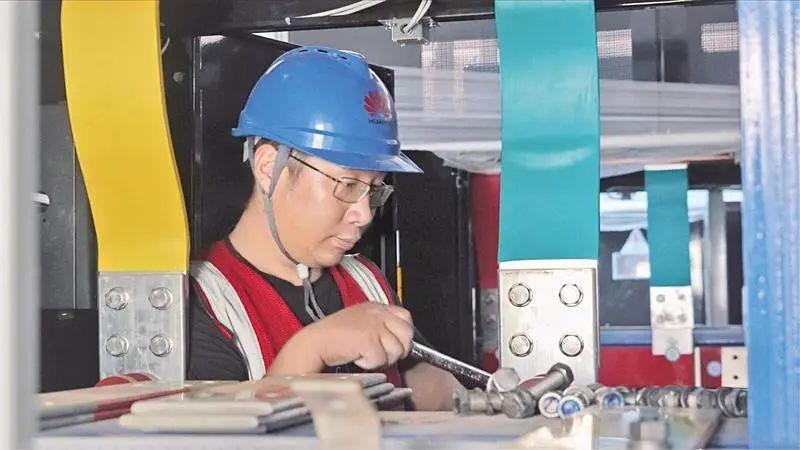 轟鳴,各種大型設(shè)備整齊擺放靜待安裝,機房內(nèi)工人們在進(jìn)行機柜及電池等相關(guān)設(shè)備安裝。