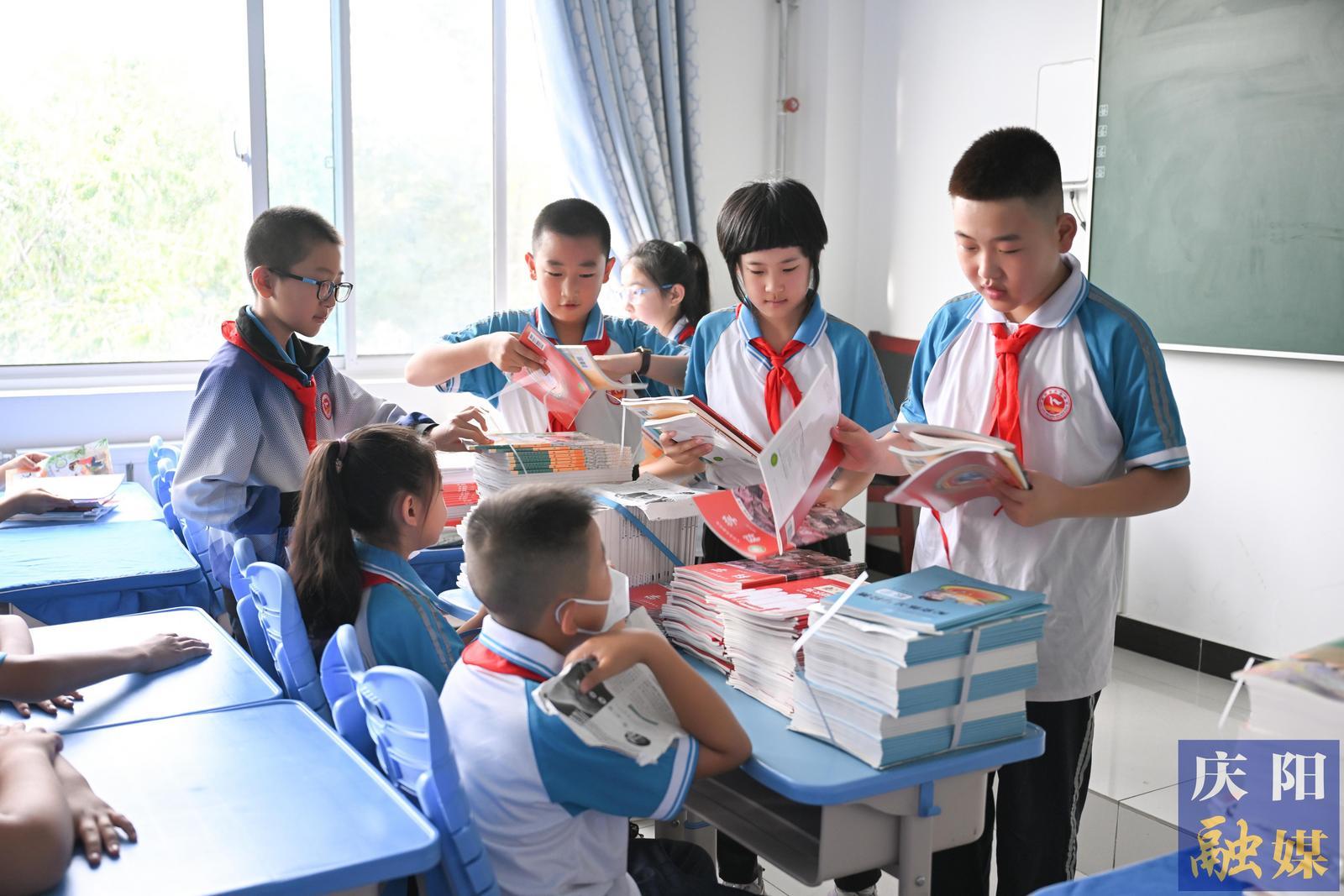 8月25日,慶陽市慶化學校五年級6班學生領取課本。