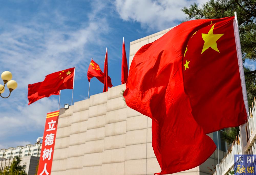 國網(wǎng)西峰區(qū)供電公司門前五星紅旗鮮艷奪目。