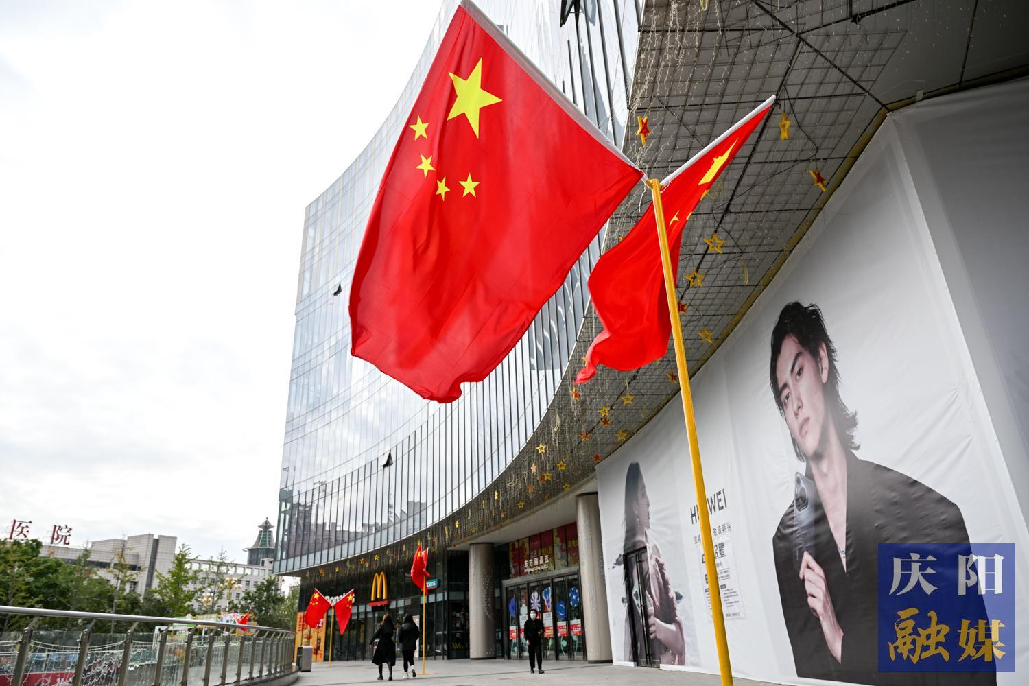 西峰區(qū)一家商城外掛滿五星紅旗,喜迎國慶。