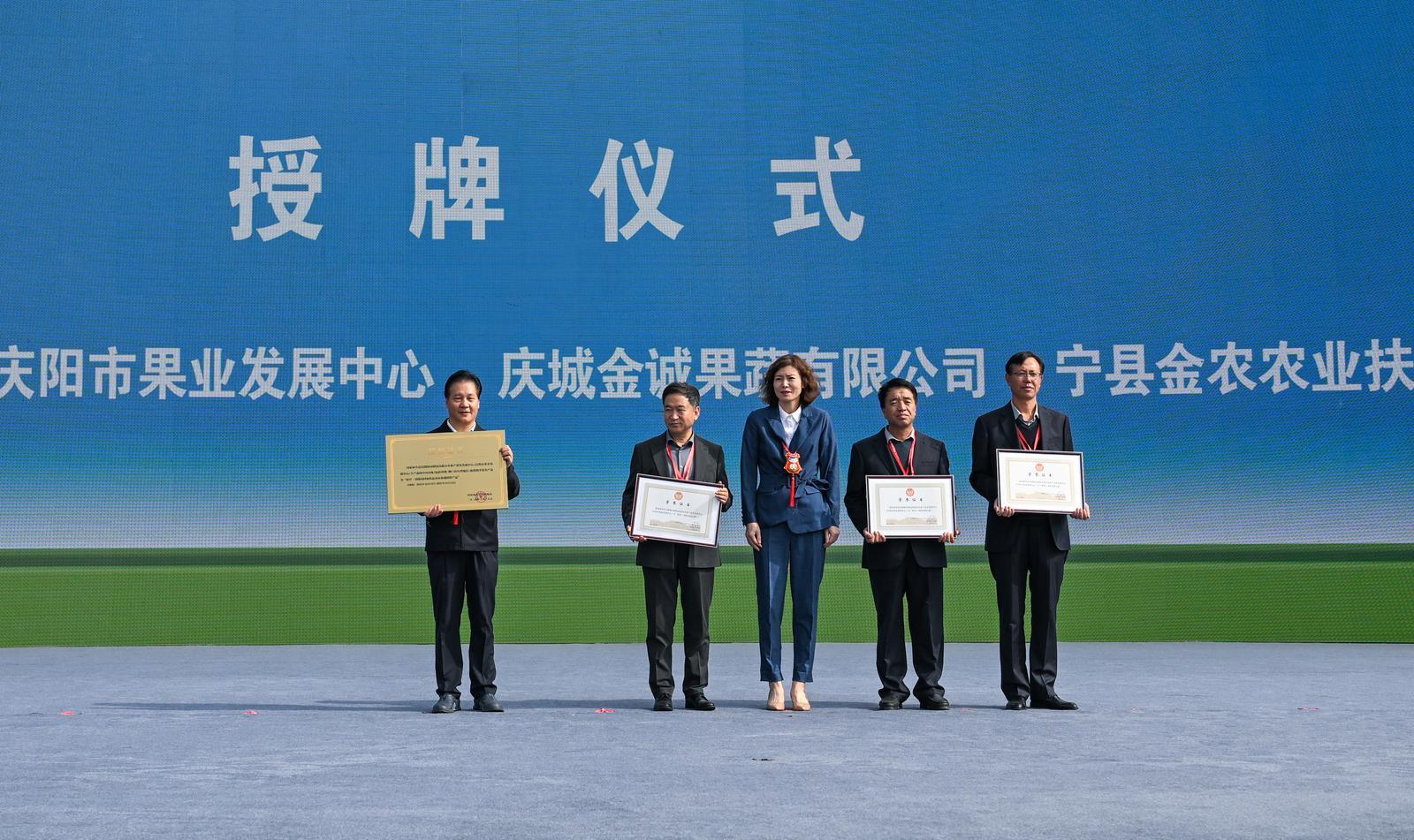 國家體育總局訓(xùn)練局營養(yǎng)膳食處處長景雪竹發(fā)布慶陽蘋果列入國家隊(duì)運(yùn)動(dòng)員備戰(zhàn)保障產(chǎn)品,并向慶陽市及居立農(nóng)業(yè)有限公司、慶城金誠果蔬有限公司、寧縣金農(nóng)農(nóng)業(yè)扶貧開發(fā)有限公司頒發(fā)授權(quán)牌。