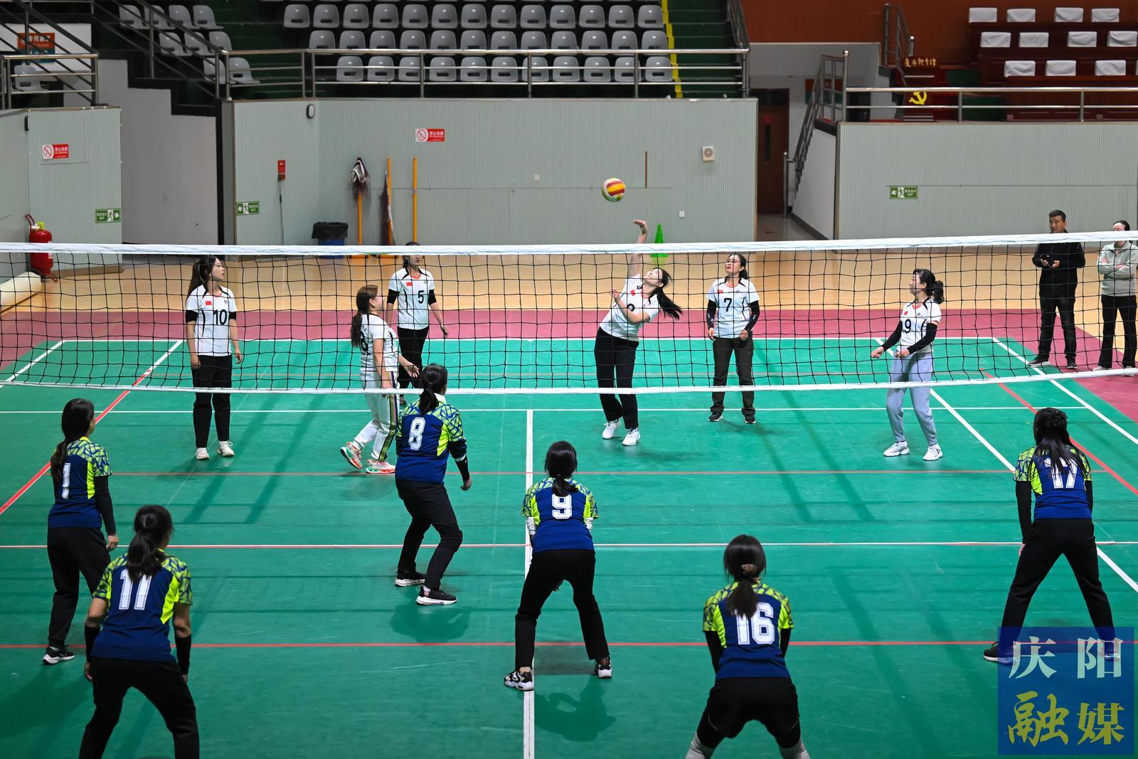 女子組比賽,慶陽市排球協(xié)會二隊代表隊對戰(zhàn)開心排球代表隊(11月4日攝)。