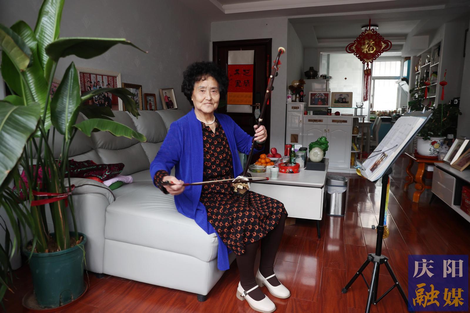 81歲的退休教師姚瑞蘭表演二胡獨奏《繡金匾》。她曾多次被評為優(yōu)秀教師和先進工作者。退休后筆耕不輟,在報刊雜志上發(fā)表多篇詩歌和散文。