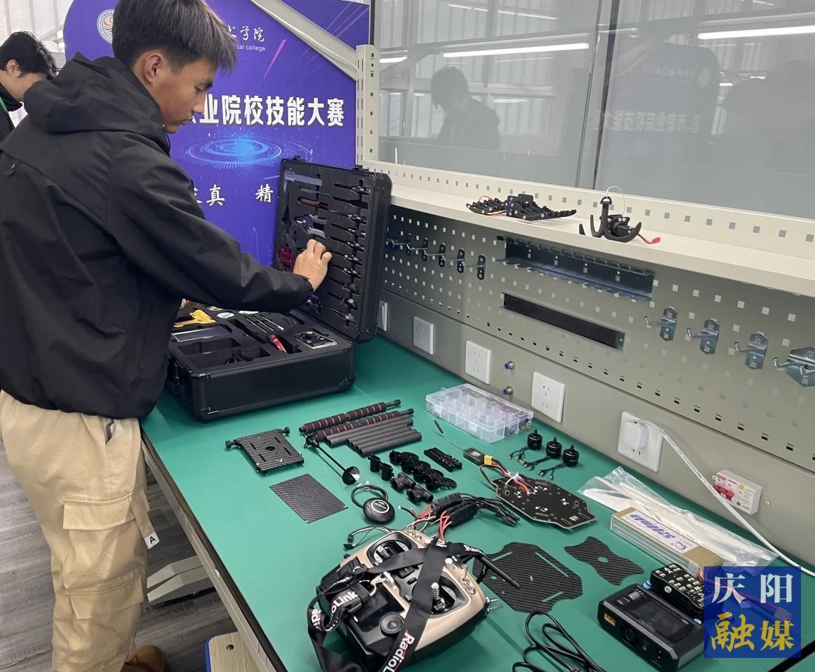 慶陽(yáng)職業(yè)技術(shù)學(xué)院賽點(diǎn)無(wú)人機(jī)操控與維護(hù)賽場(chǎng)參賽選手正在對(duì)無(wú)人機(jī)進(jìn)行系統(tǒng)調(diào)試與校準(zhǔn)工作。慶陽(yáng)職業(yè)技術(shù)學(xué)院供圖