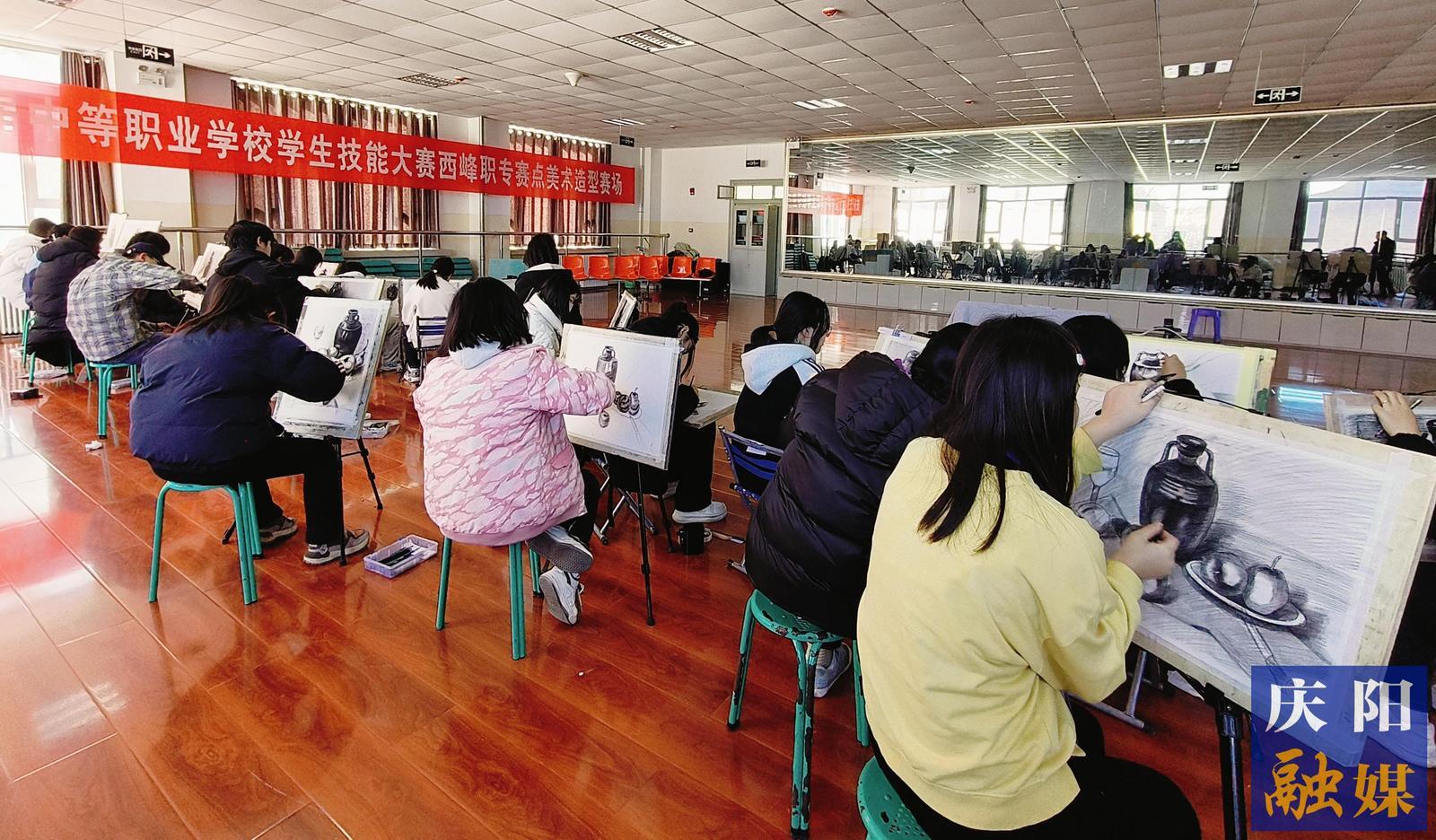 美術(shù)造型賽場(chǎng)參賽學(xué)生正在進(jìn)行素描實(shí)物寫生比拼。慶陽(yáng)融媒記者 張靜 攝
