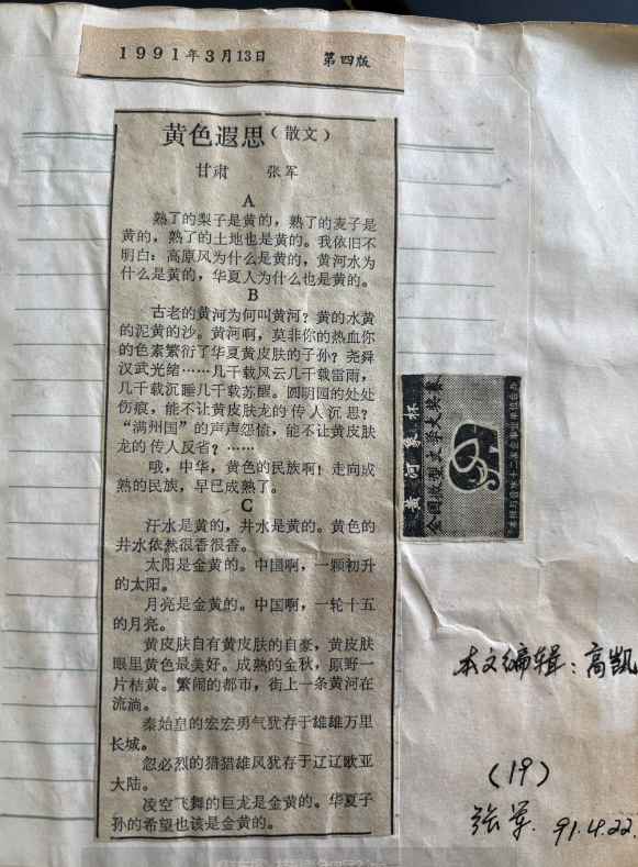 幾天后,一篇題為《黃色遐思》的散文終于誕生了,這篇短文通過一系列的聯(lián)想與描述,表達(dá)了自己對(duì)黃土地、華夏民族以及偉大祖國(guó)的無限感激與熱愛。1991年1月13日晚上,我將最終定稿的散文《黃色遐思》工工整整地寫在自己特意買來的稿紙上,小心翼翼地裝進(jìn)信封,第二天,騎自行車冒著刺骨的寒風(fēng)到五公里之外的縣城郵局去郵寄。稿件寄出之時(shí),我仿佛完成了一份光榮的任務(wù)。盡管之前自己已經(jīng)在其他報(bào)紙上發(fā)表過幾篇習(xí)作,但這次畢竟是第一次給心目中神圣的家鄉(xiāng)報(bào)紙《隴東報(bào)》投稿,心里既興奮又緊張。驚喜有時(shí)會(huì)在不經(jīng)意間突然降臨。近兩個(gè)月之后,我驚喜地發(fā)現(xiàn)自己的散文《黃色遐思》刊發(fā)在1991年3月13日的《隴東報(bào)》第四版“黃河象杯”全國(guó)微型文學(xué)大獎(jiǎng)賽專版上。不久,我便收到了編輯部寄來的墨香濃郁的樣報(bào)。