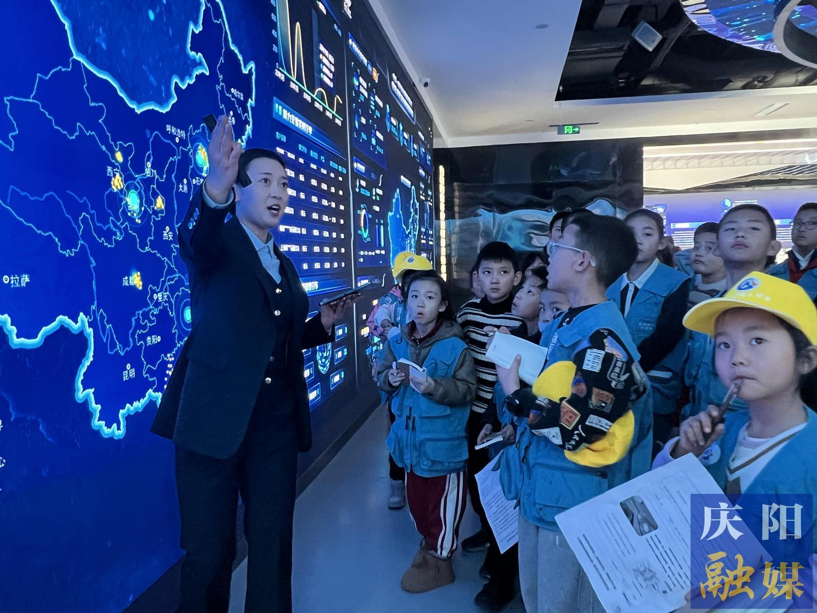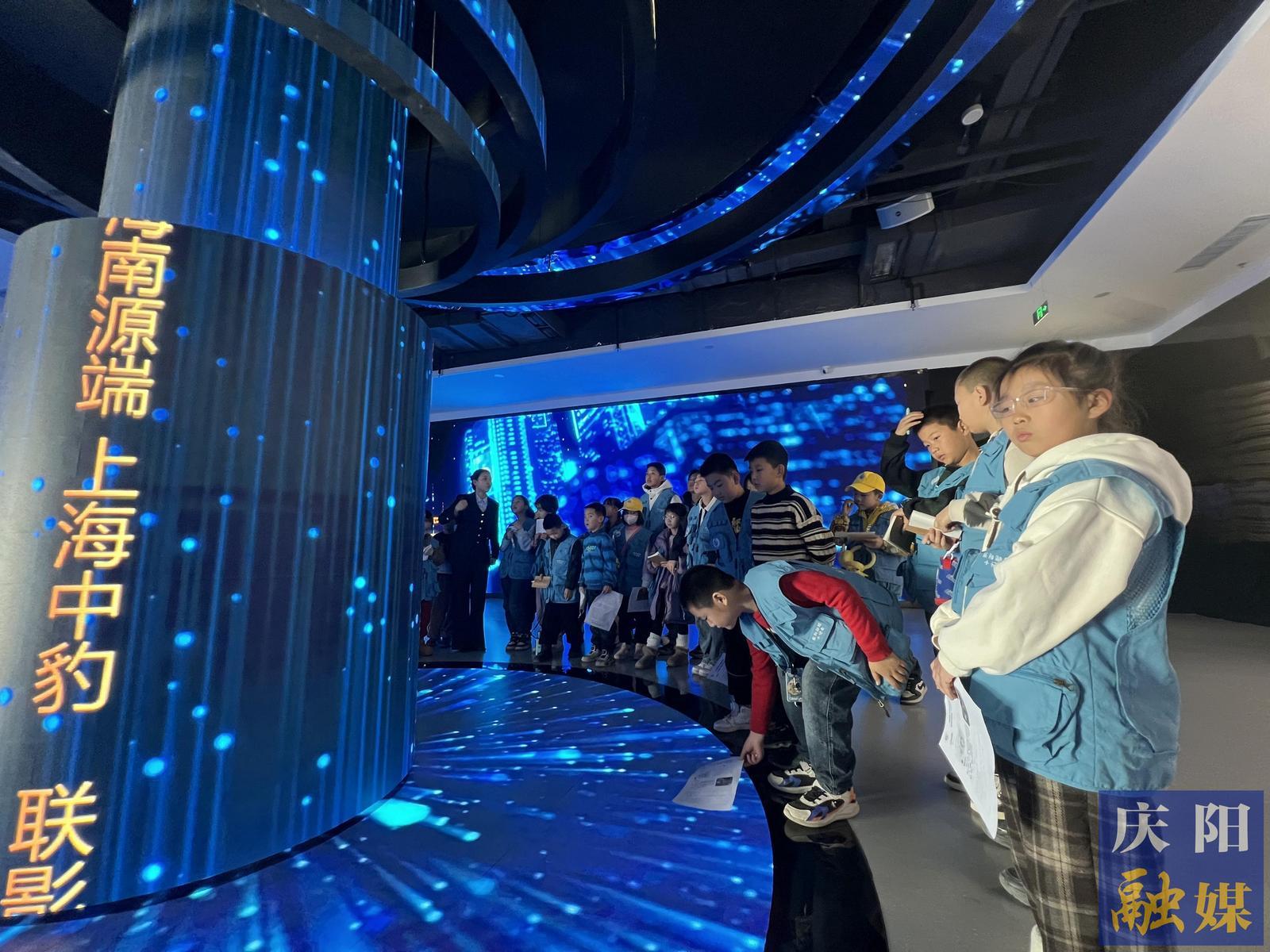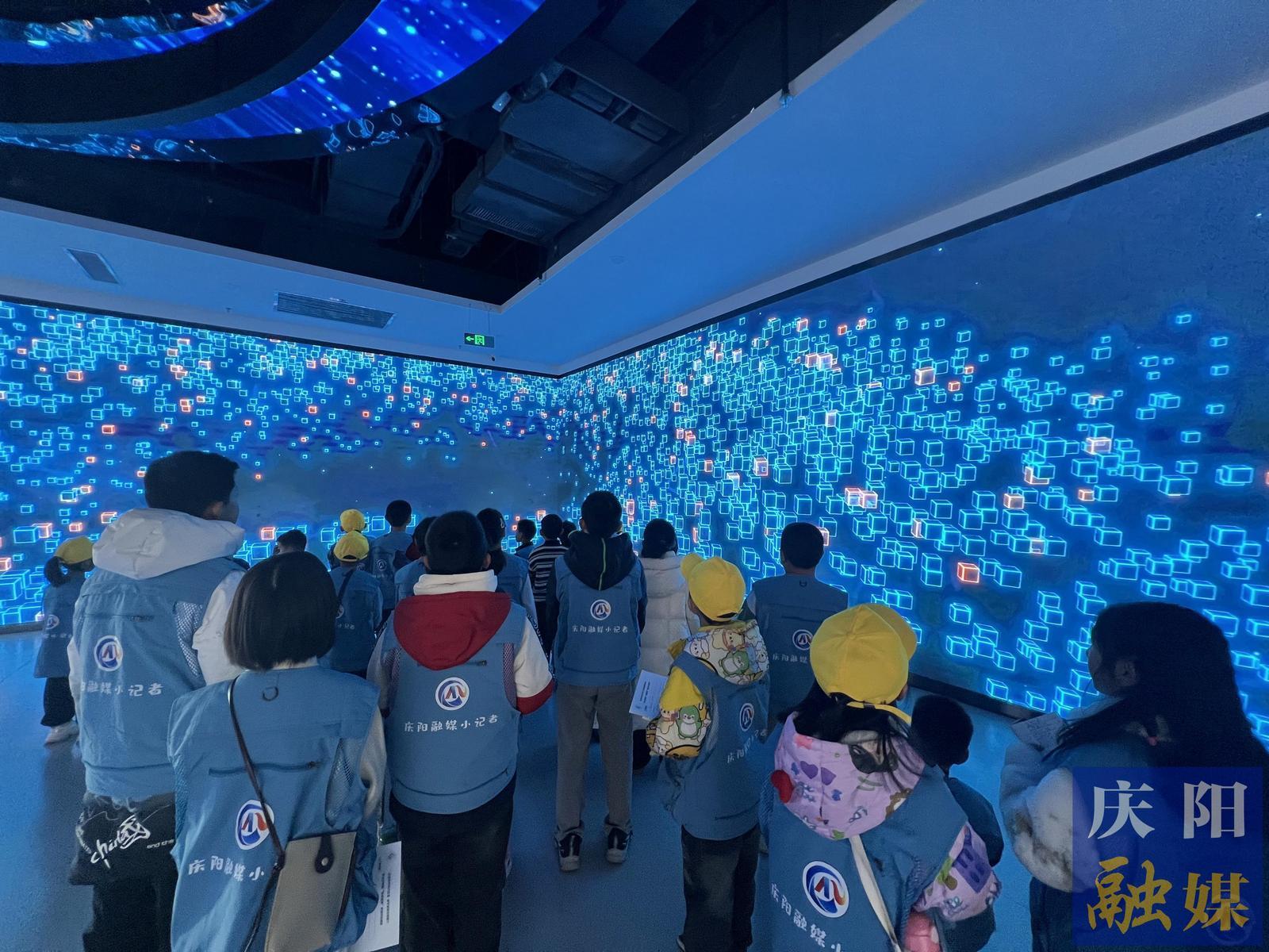 在慶陽(yáng)云創(chuàng)公司講解員李肖肖的帶領(lǐng)下,小記者們踏入了這個(gè)充滿科技感的展示空間。一進(jìn)門(mén),一幅巨大的數(shù)字畫(huà)卷映入眼簾,生動(dòng)展現(xiàn)了慶陽(yáng)市近年來(lái)在“東數(shù)西算”工程中的最新成果和亮點(diǎn)。小記者們紛紛駐足,用好奇的目光審視著這片數(shù)字世界的“新大陸”。