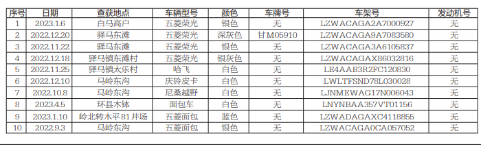 為了認(rèn)真貫徹落實全市油區(qū)治安管理工作會議精神,嚴(yán)厲打擊涉油“三無”車輛,依據(jù)國家相關(guān)法律法規(guī)規(guī)定,現(xiàn)將2021年1月至2023年1月期間,在環(huán)縣、慶城、華池油區(qū)查獲的48臺無牌、無證、無法確認(rèn)車主,且發(fā)動機號/車架號損毀(挫改)嚴(yán)重的“三無”車輛進(jìn)行公告,請車輛所有人自本公告發(fā)布之日起3個月內(nèi),前來慶陽市公安局長慶分局治安警察大隊接受處理,逾期不接受處理者,將按無主車輛予以拆解報廢。