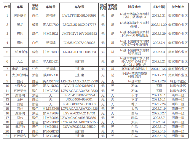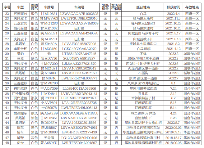 為了認真貫徹落實全市油區(qū)治安管理工作會議精神,嚴厲打擊涉油“三無”車輛,依據(jù)國家相關(guān)法律法規(guī)規(guī)定,現(xiàn)將2021年1月至2023年1月期間,在環(huán)縣、慶城、華池油區(qū)查獲的48臺無牌、無證、無法確認車主,且發(fā)動機號/車架號損毀(挫改)嚴重的“三無”車輛進行公告,請車輛所有人自本公告發(fā)布之日起3個月內(nèi),前來慶陽市公安局長慶分局治安警察大隊接受處理,逾期不接受處理者,將按無主車輛予以拆解報廢。