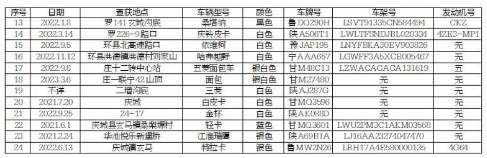 為了認(rèn)真貫徹落實(shí)全市油區(qū)治安管理工作會(huì)議精神,嚴(yán)厲打擊各類違法犯罪分子利用“三無”車輛實(shí)施違法犯罪活動(dòng),依據(jù)公安機(jī)關(guān)《辦理行政案件程序規(guī)定》,現(xiàn)將2021年1月至2023年3月來在環(huán)縣,華池、慶城、合水油區(qū)治安整治過程中査獲的24臺(tái)無牌、無證、無法確認(rèn)車主,且發(fā)動(dòng)機(jī)號(hào)/車架號(hào)損毀(挫改)嚴(yán)重的“三無”車輛進(jìn)行公告,在全國機(jī)動(dòng)車系統(tǒng)中無法查詢涉油嫌疑車輛信息(附明細(xì)),請(qǐng)車輛所有人自本公告發(fā)布之日起3個(gè)月內(nèi),前來慶陽市公安局長慶分局治安警察大隊(duì)接受處理,逾期不接受處理者,將按無主車輛予以拆解報(bào)廢。聯(lián)系電話:0934-8380764
