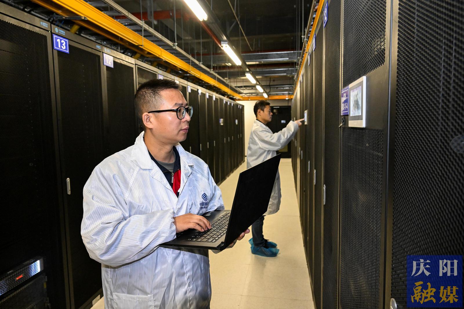 中國移動(甘肅·慶陽)綠色智算中心,技術(shù)人員在IDC機房檢查設備運行情況。