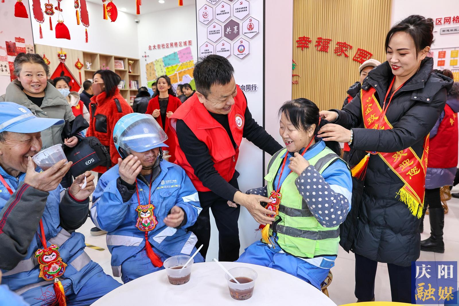 西峰區(qū)北大街社區(qū)工作人員給環(huán)衛(wèi)工人贈送香包。
