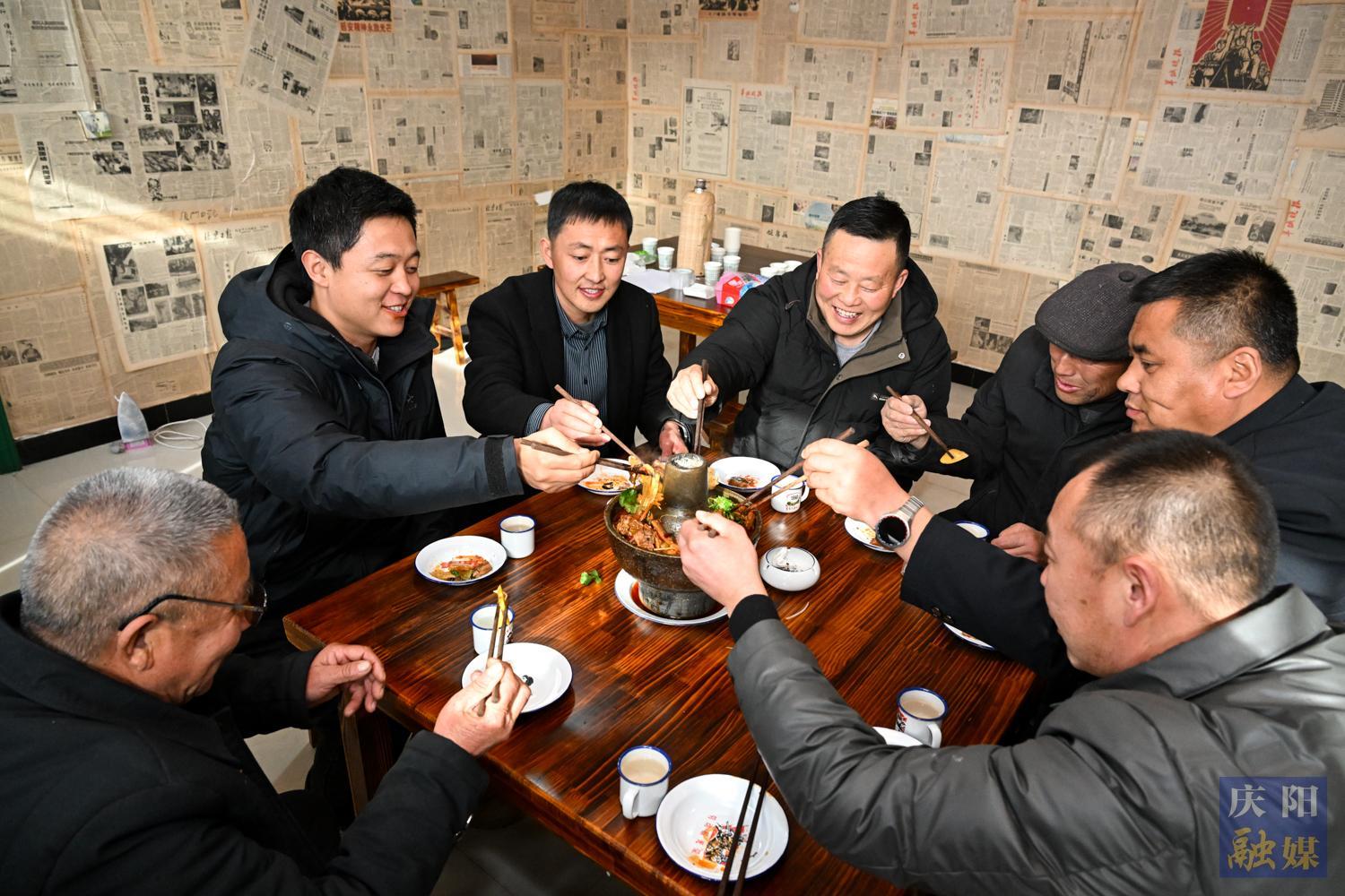 年關(guān)將近,走進(jìn)合水縣太莪鄉(xiāng)黑木村,村民們忙著壓粉條、炸面果、釀黃酒;公社食堂的院子里,吊爐火鍋中的食材上下翻滾,土暖鍋的肉片在炭火的炙烤下“滋滋”冒著熱氣……