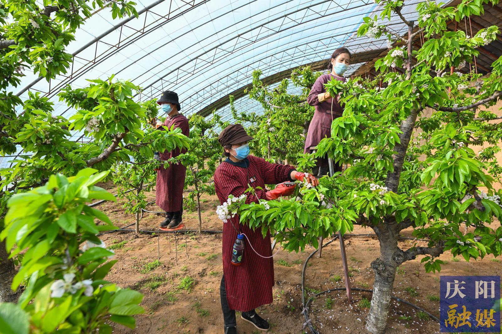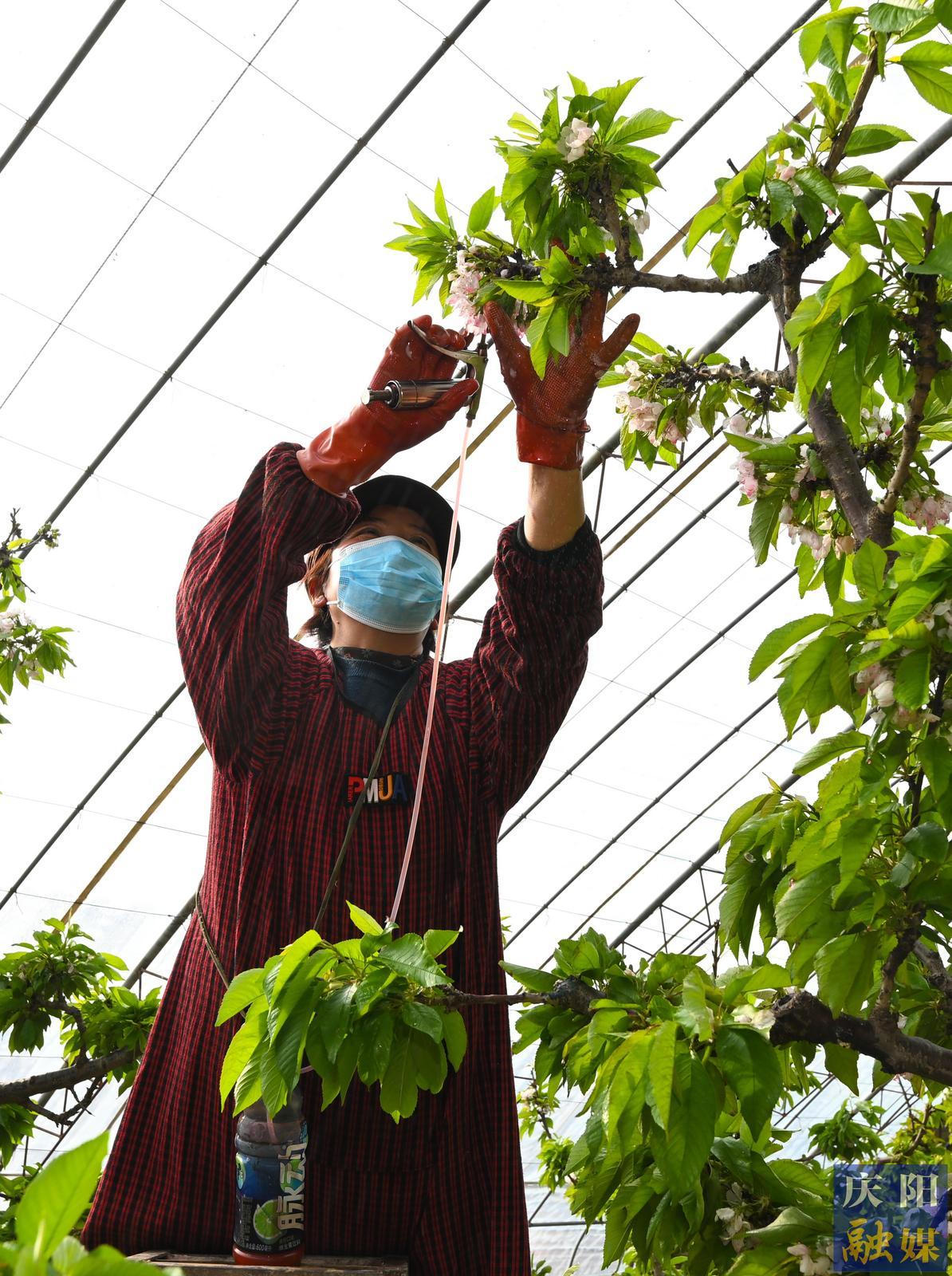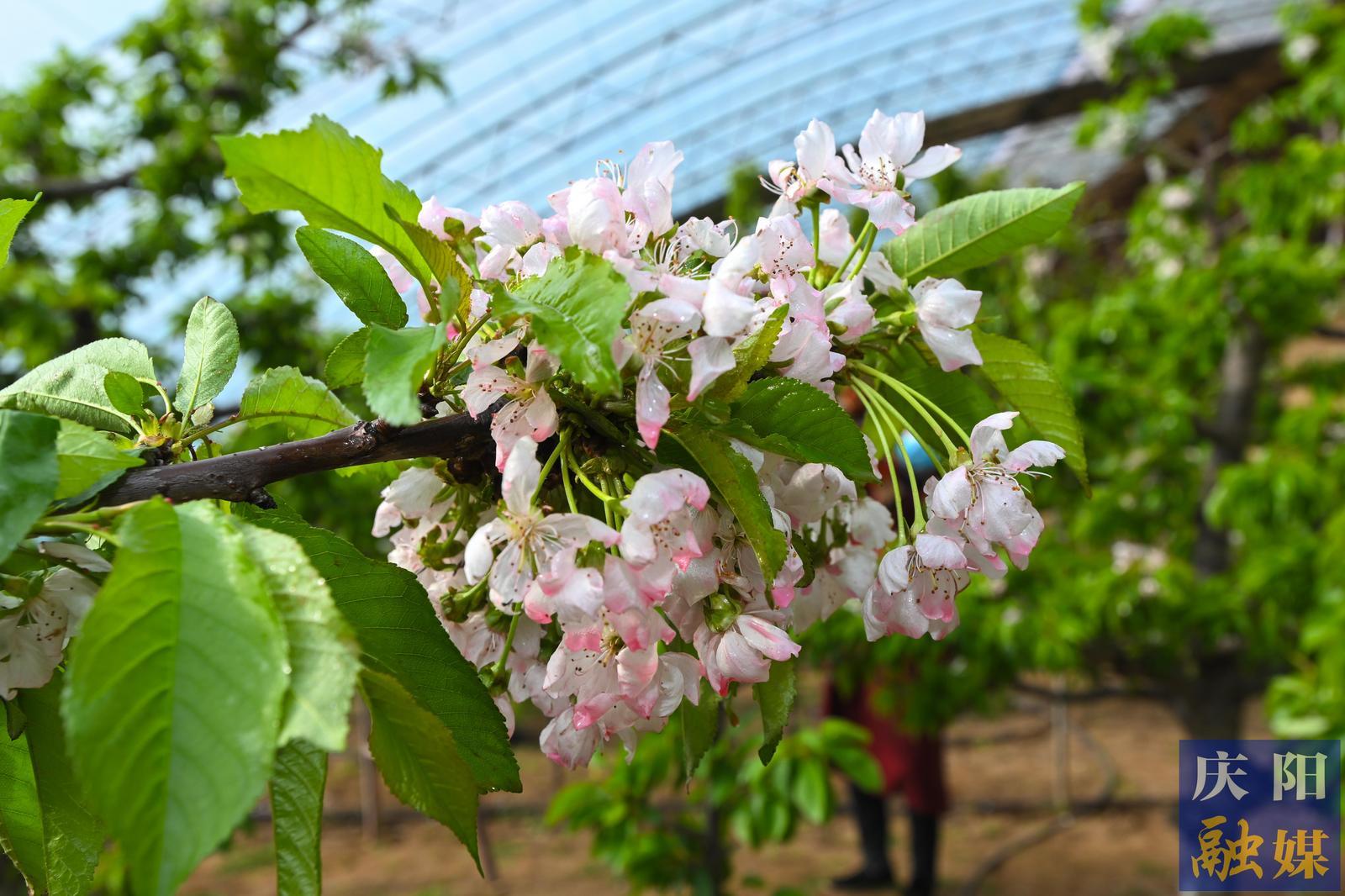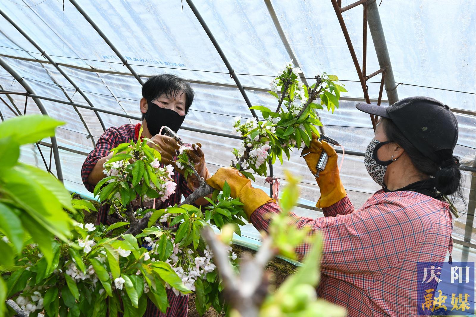 在文安村,日光溫室內(nèi)櫻桃花競(jìng)相綻放,工人正忙著給櫻桃花進(jìn)行人工授粉等作業(yè)。慶陽櫻緣種植農(nóng)民專業(yè)合作社管理人員秦華陽介紹,人工授粉是為了提高掛果率,增產(chǎn)增收。