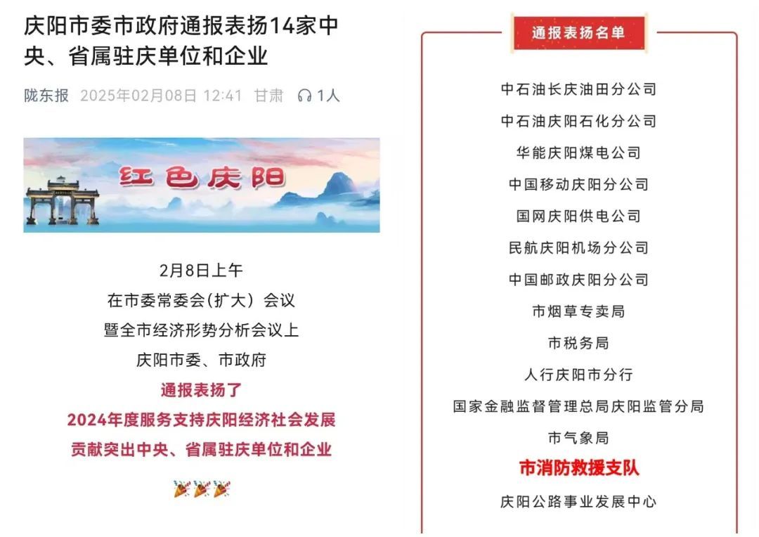 2月8日,慶陽市委常委會(擴(kuò)大)會議暨全市經(jīng)濟(jì)形勢分析會上,通報表揚(yáng)了2024年度服務(wù)支持慶陽經(jīng)濟(jì)社會發(fā)展突出中央、省屬駐慶單位和企業(yè)14家,支隊位列其中。