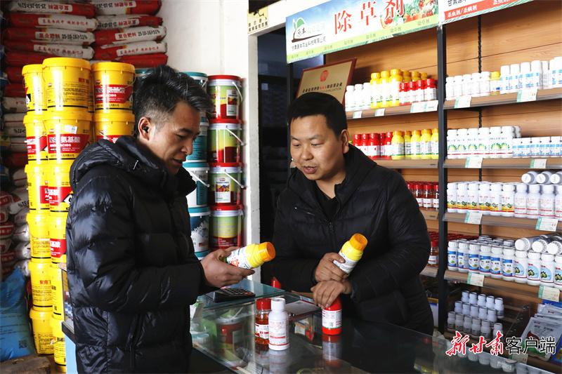 西峰區(qū)農(nóng)資銷售網(wǎng)點商戶為農(nóng)戶挑選適宜農(nóng)藥。(圖片由西峰區(qū)融媒體中心提供)
