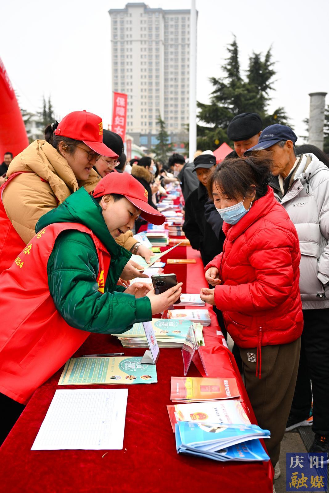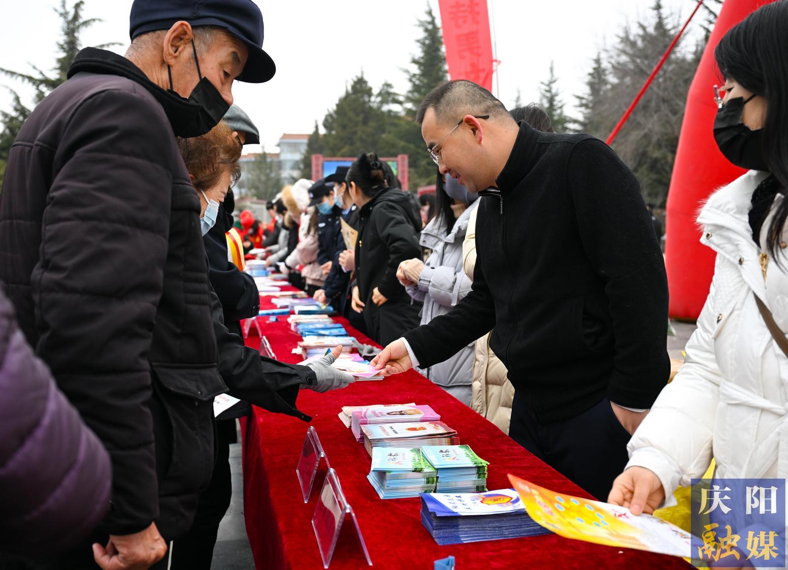 慶陽市委政法委工作人員向市民發(fā)放普法宣傳冊(cè)。