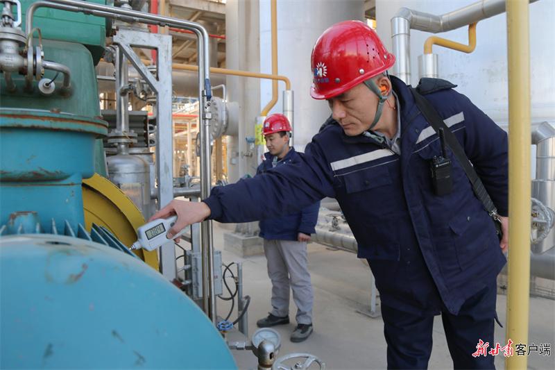 西峰區(qū)天然氣提氦與儲備調峰企業(yè)工人檢查設備運行情況。