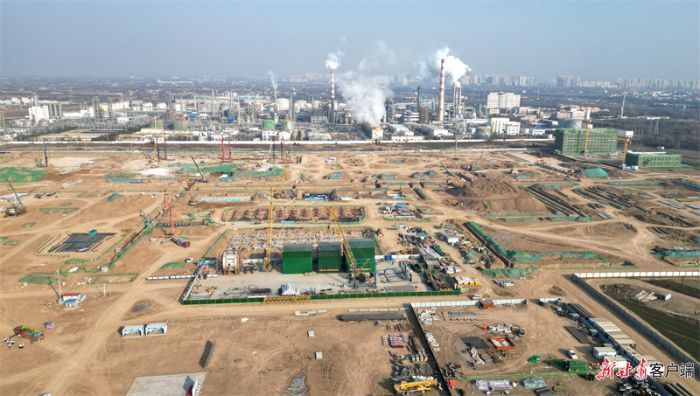 離慶陽瑞海嘉提氦項目不遠處的慶陽同欣50萬噸/年輕烴深加工項目建設現(xiàn)場,機械轟鳴,車輛穿梭,一派火熱建設場景。