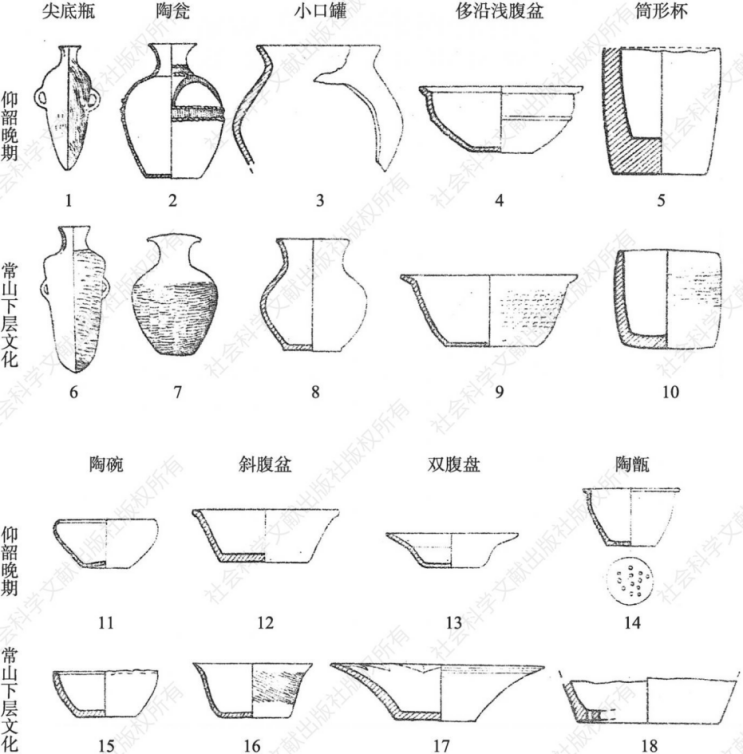 常山下層文化遺存雖發(fā)現(xiàn)較早,但長期被誤認(rèn)作齊家文化或客省莊二期文化。1979年秋,隨著常山遺址發(fā)掘工作的推進(jìn),發(fā)現(xiàn)它與齊家文化聯(lián)系緊密,與客省莊第二期文化、廟底溝二期文化有相同或相似之處,可是,它們各自文化性質(zhì)是不相同的。胡謙盈先生認(rèn)為分布在寧夏南部和隴山東西兩側(cè),涇渭兩河等地區(qū)命名的齊家文化其實(shí)是屬于客省莊二期文化和常山下層文化遺存。經(jīng)碳14測定,常山下層文化年代約為公元前2930±180年(樹輪校正年代),廟底溝二期文化(約公元前2700 - 前2400年),陜西客省莊第二期文化(約公元前2400 -前2000年),甘肅齊家文化(約公元前2200 - 前1600年),常山下層文化比后兩者原始文化分別早七、八百年。為將常山遺址作為獨(dú)特文化典型深入研究,避免名稱限制對其與其他文化關(guān)系的探討,胡謙盈先生提出“常山下層文化”這一命名,以區(qū)別于“齊家文化”或“客省莊第二期文化”,并認(rèn)為它是齊家文化的重要源頭之一。
