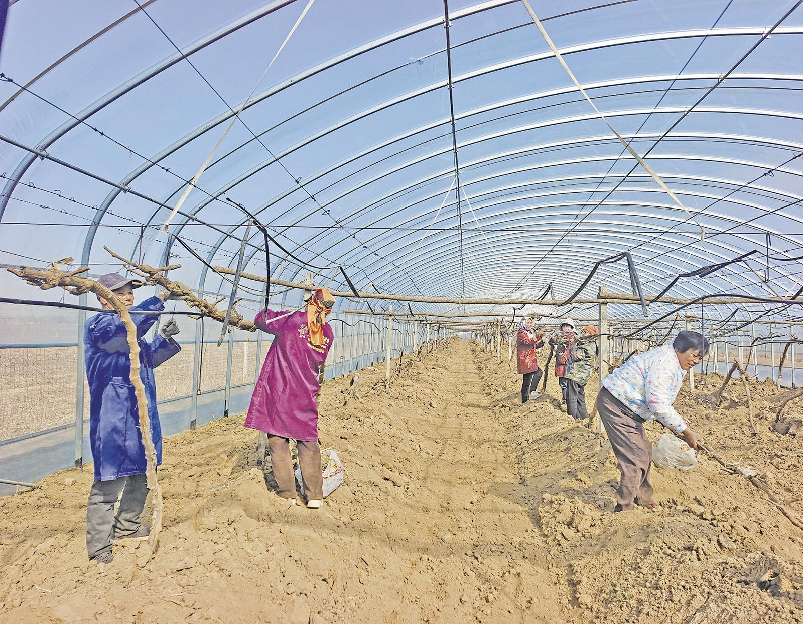 葡萄藤起土上架是葡萄種植過程中一項至關(guān)重要的農(nóng)耕措施。冬季,為了防止葡萄藤遭受低溫凍害,合作社對葡萄藤進(jìn)行修剪,并用土壓埋。次年春季再起藤上架,這樣做既能保障葡萄藤安全越冬,又能促進(jìn)果苗花芽分化,開始新一輪的生長周期。