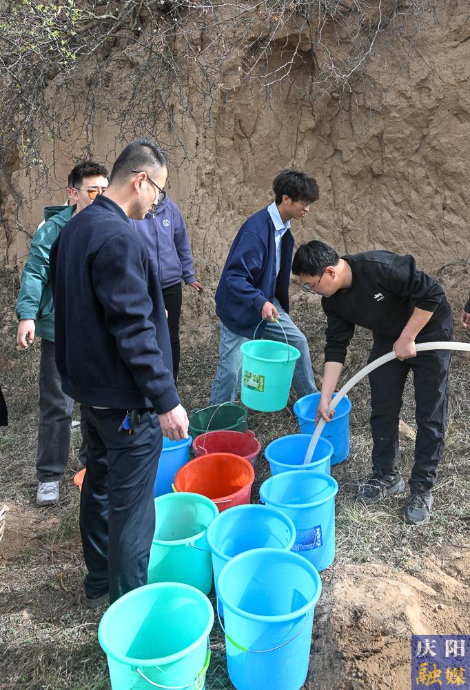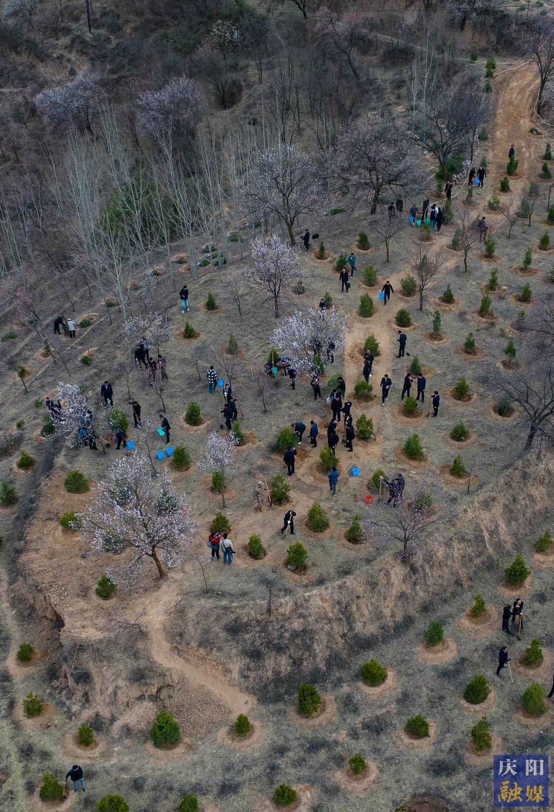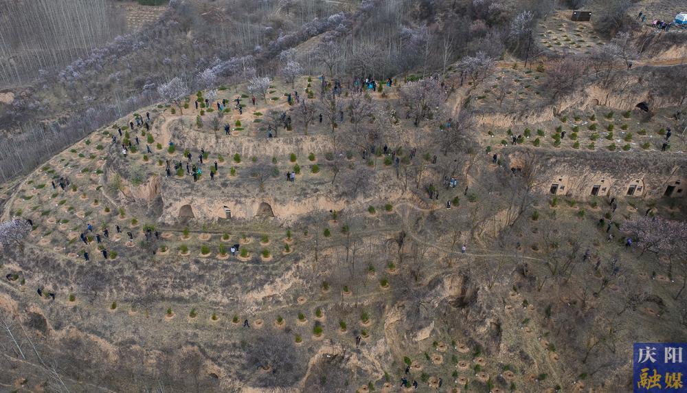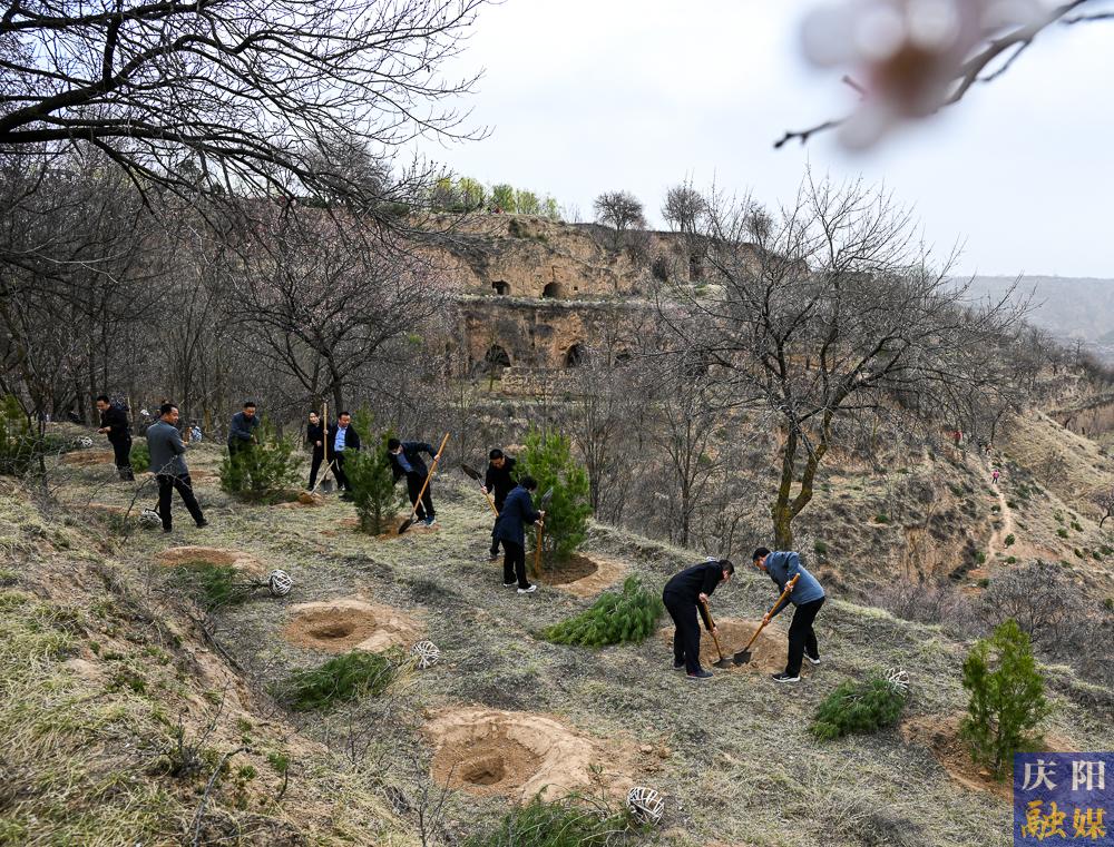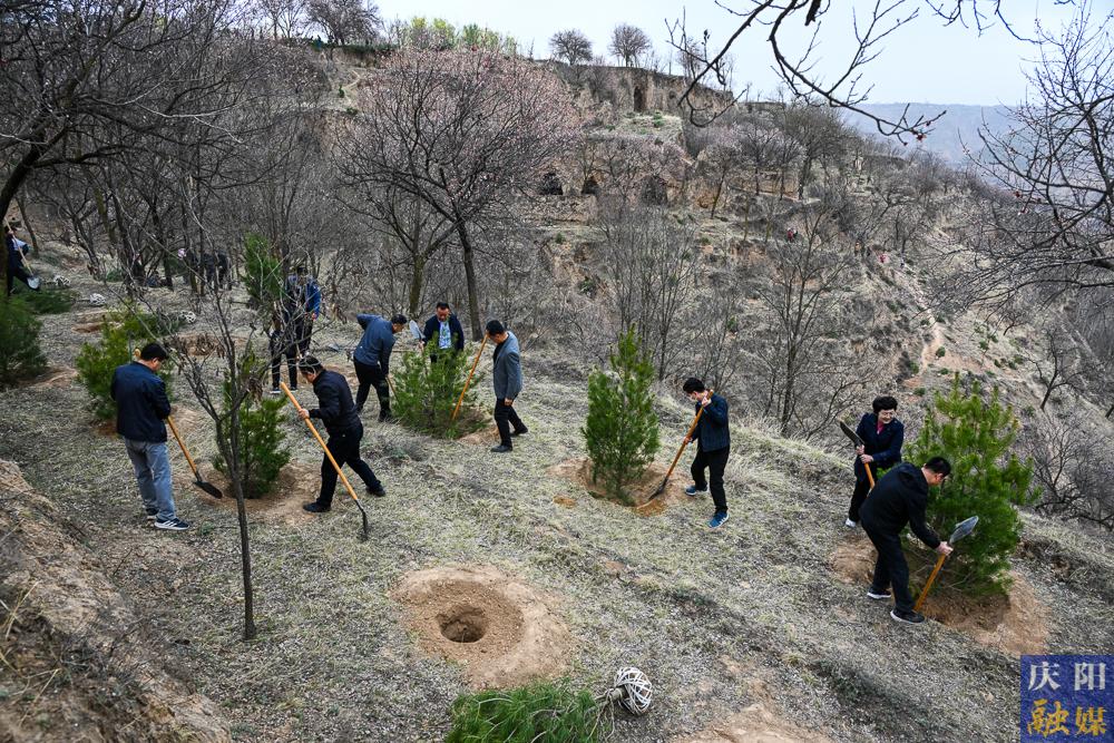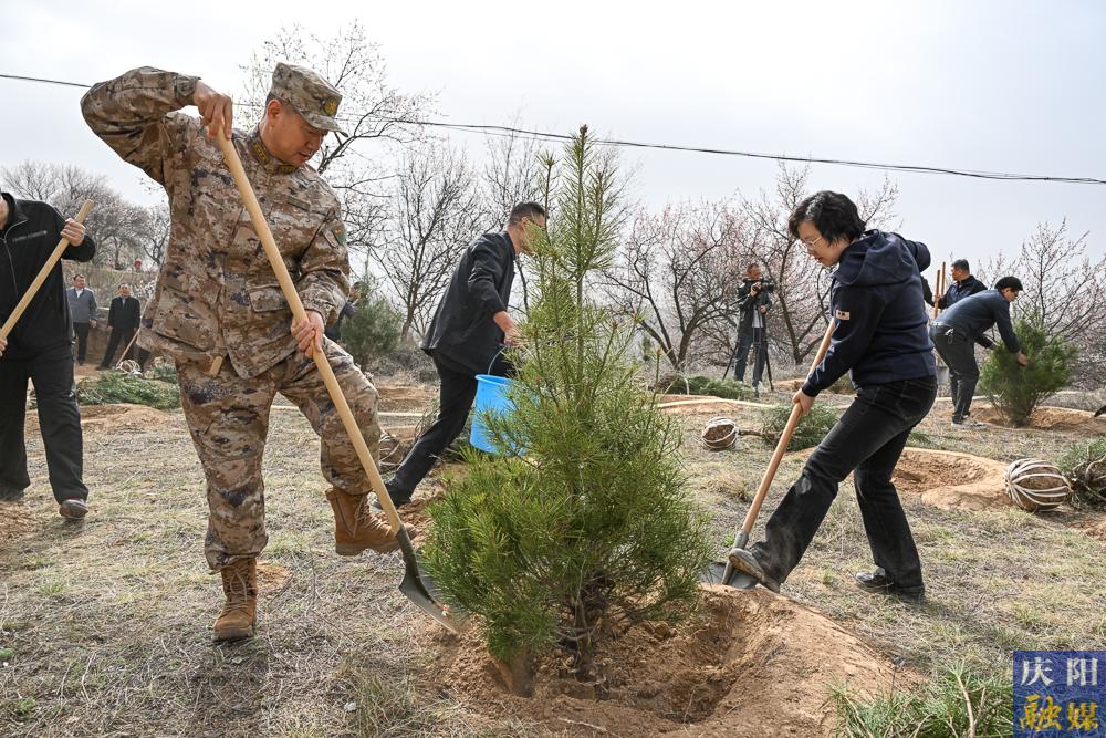 干部職工在西峰區(qū)后官寨鎮(zhèn)路堡村開展義務植樹活動。