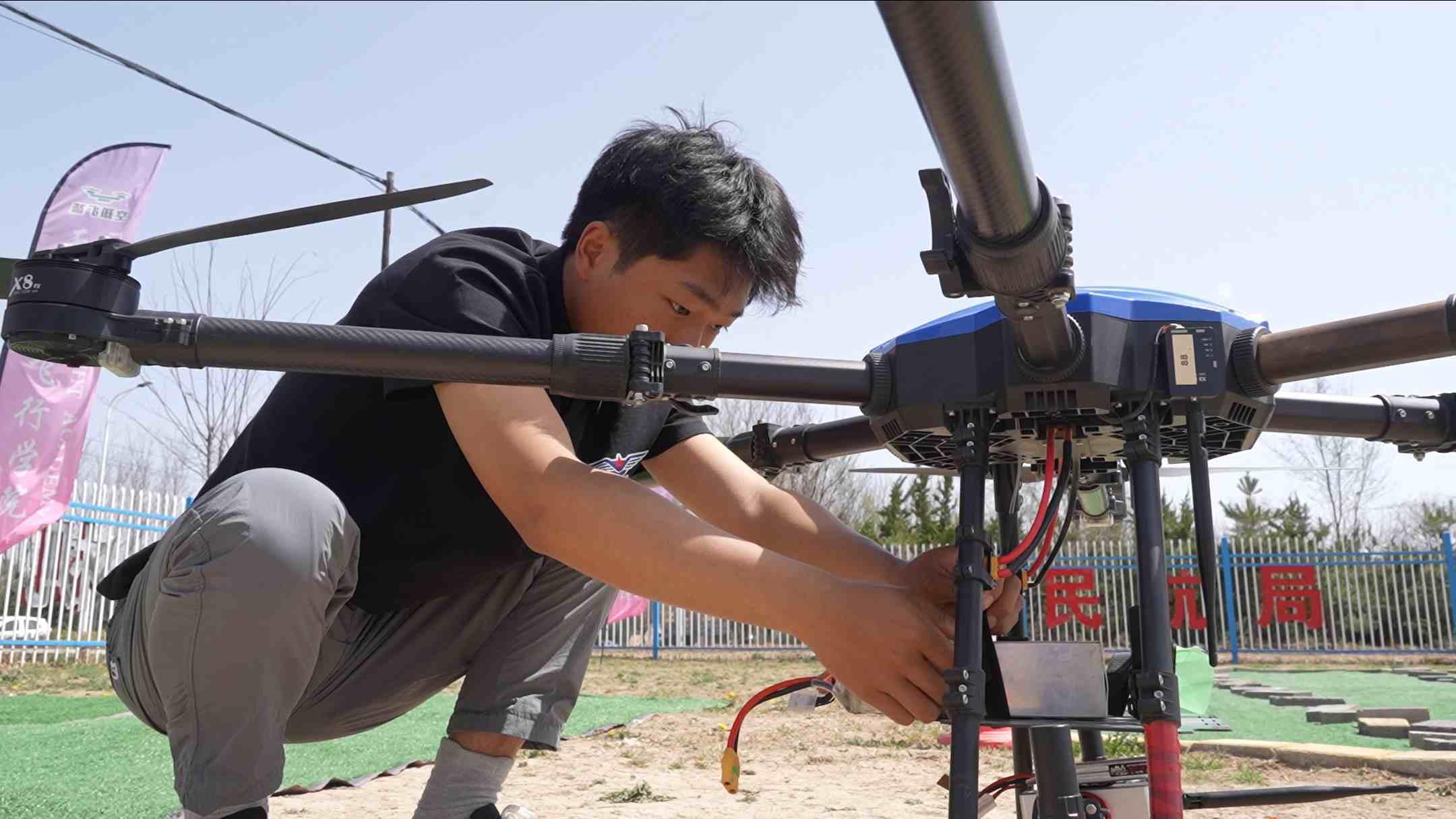 飛手正在為無人機(jī)更換電池。馮喜斌攝