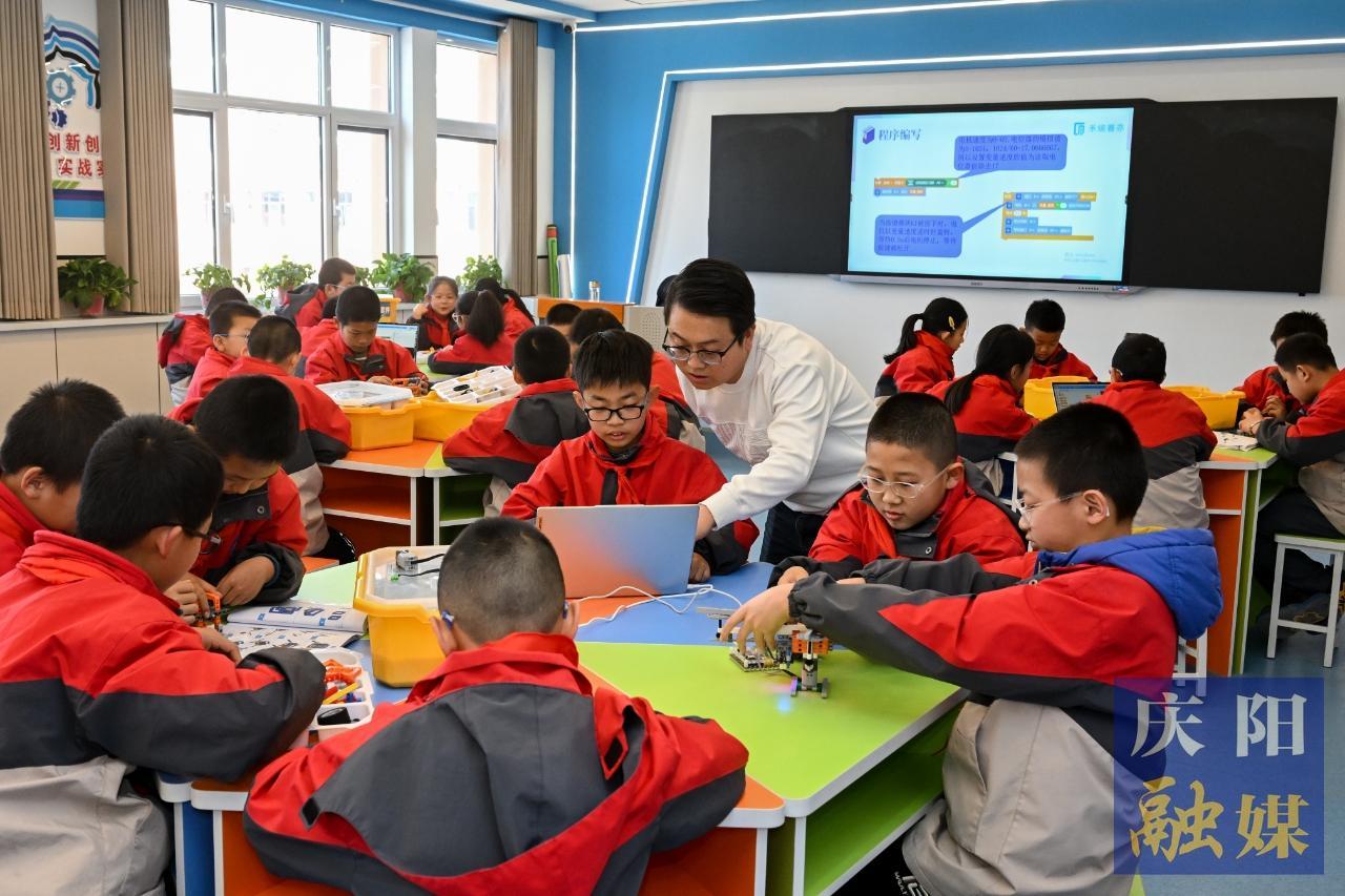鎮(zhèn)原縣蓮池小學(xué),學(xué)生在創(chuàng)客教育課上學(xué)習(xí)程序編寫知識(shí),組裝創(chuàng)意編程套件。慶陽融媒記者 俄少飛 攝