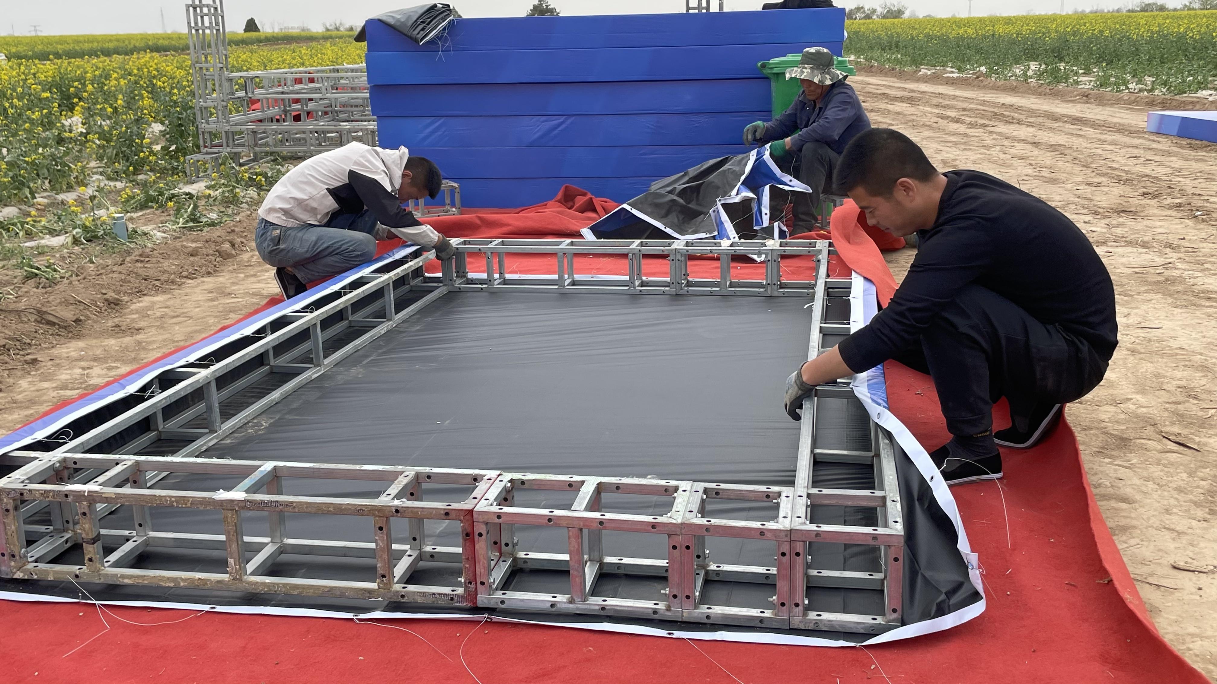 走進(jìn)現(xiàn)場(chǎng),彩旗飄飄,成片的油菜花在風(fēng)中搖曳,工人們正在搭建舞臺(tái)框架,他們站在腳手架上,認(rèn)真測(cè)量,精準(zhǔn)定位,將一塊塊LED顯示板精準(zhǔn)地拼接在一起。另一邊,電力工人正在正仔細(xì)檢查供電線路和設(shè)備的調(diào)試,確保比賽期間電力供應(yīng)的穩(wěn)定性和安全性。
