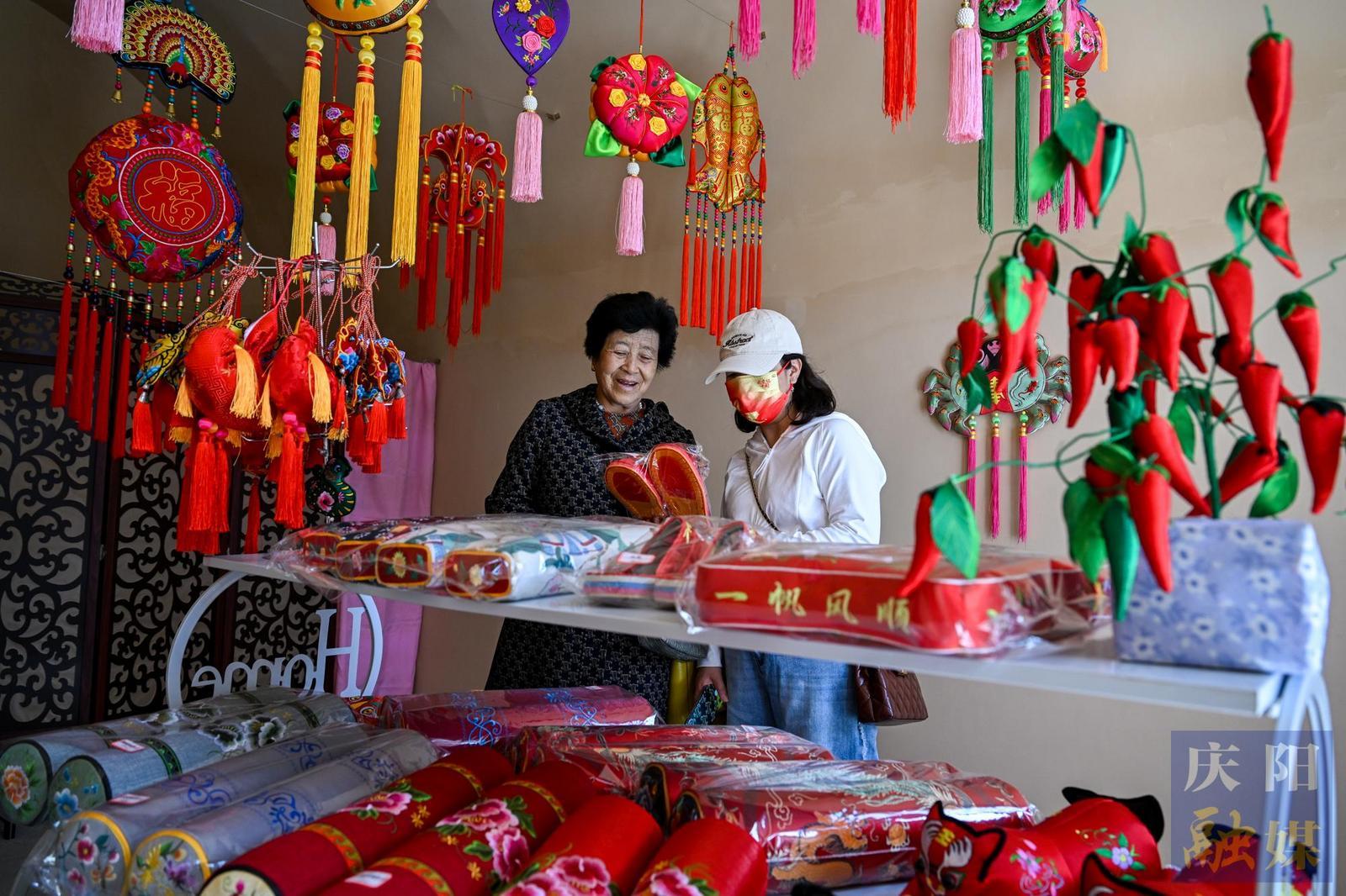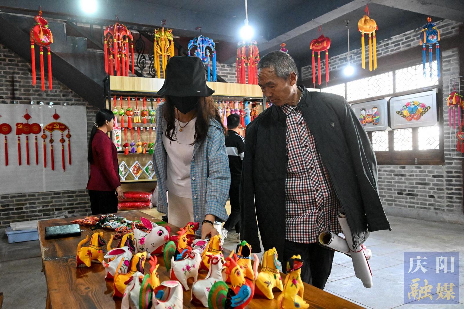 游客在文玩藝術(shù)會(huì)館參觀香包、刺繡等手工藝品。