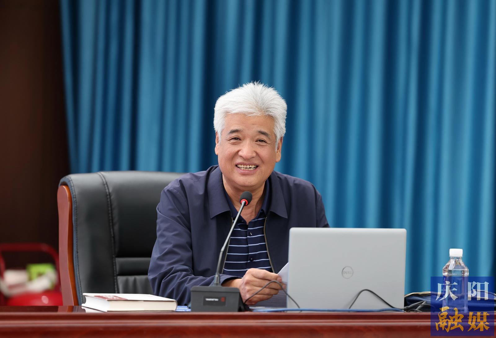 原甘肅日報社編委、評論部主任,高級編輯尚德琪以《關于新聞報道的十個問題》為題授課(4月22日攝)。