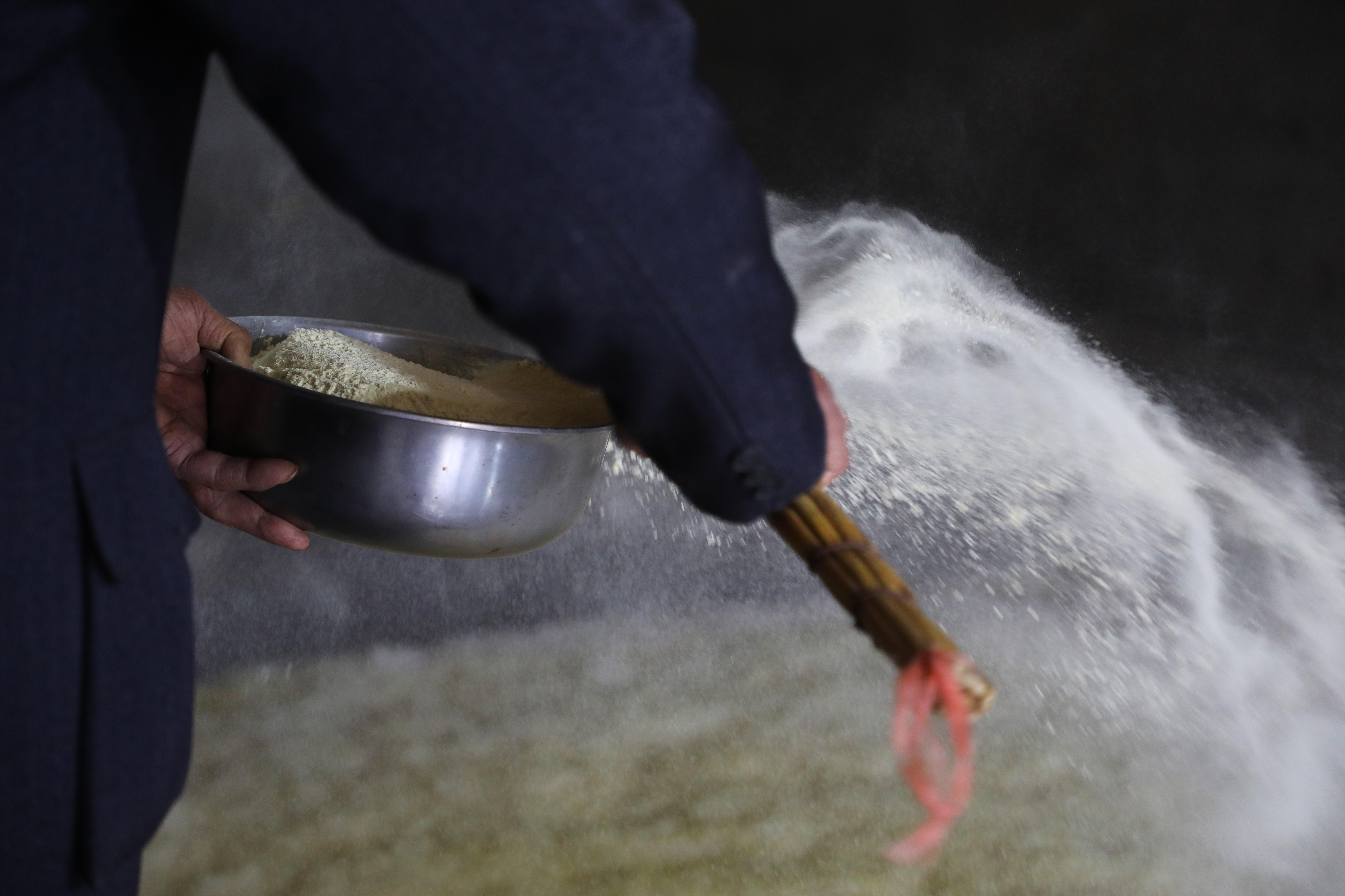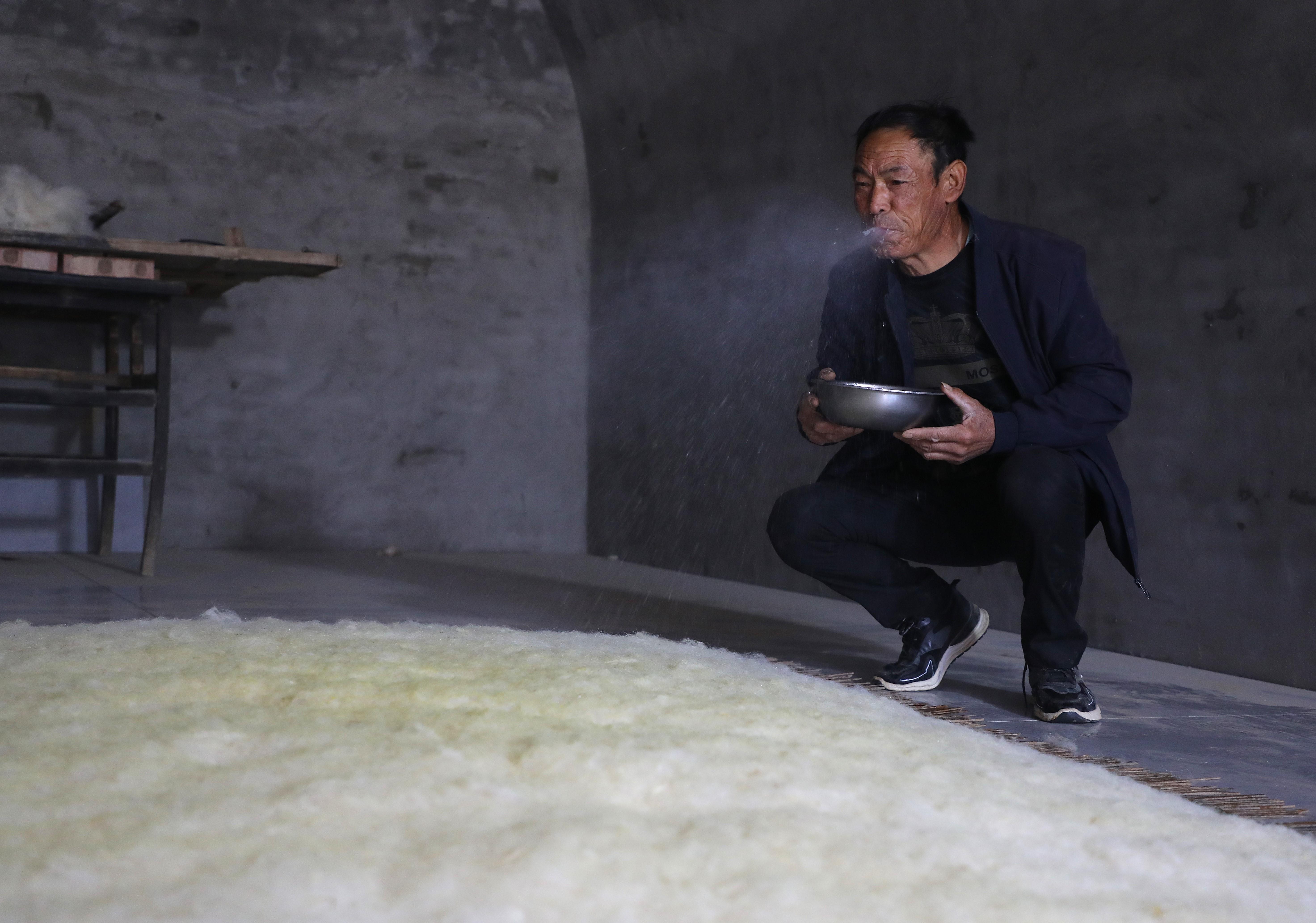 第七道撒面,在噴過油和水的羊毛上撒上糜面,輕拍后再覆上一層羊毛。