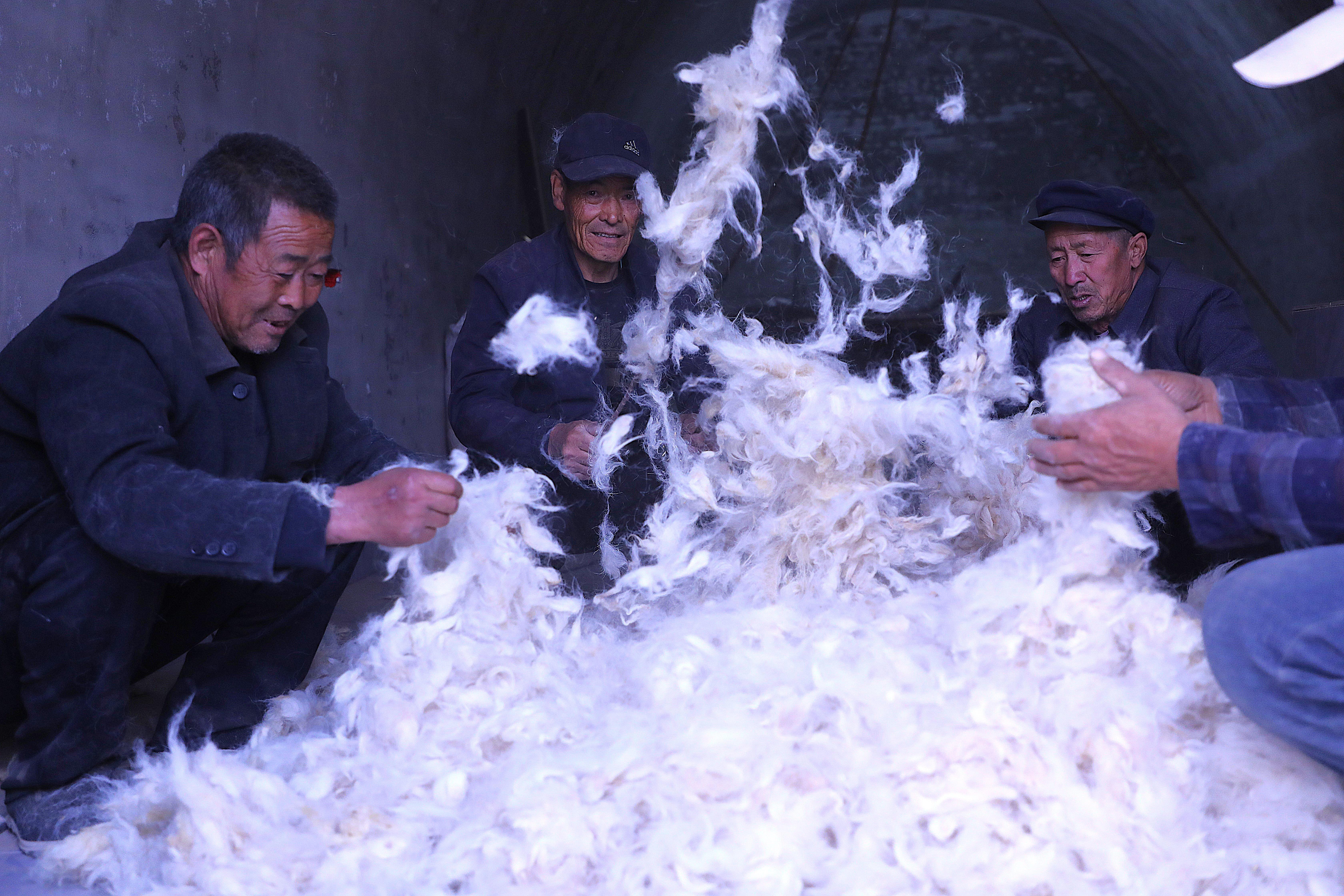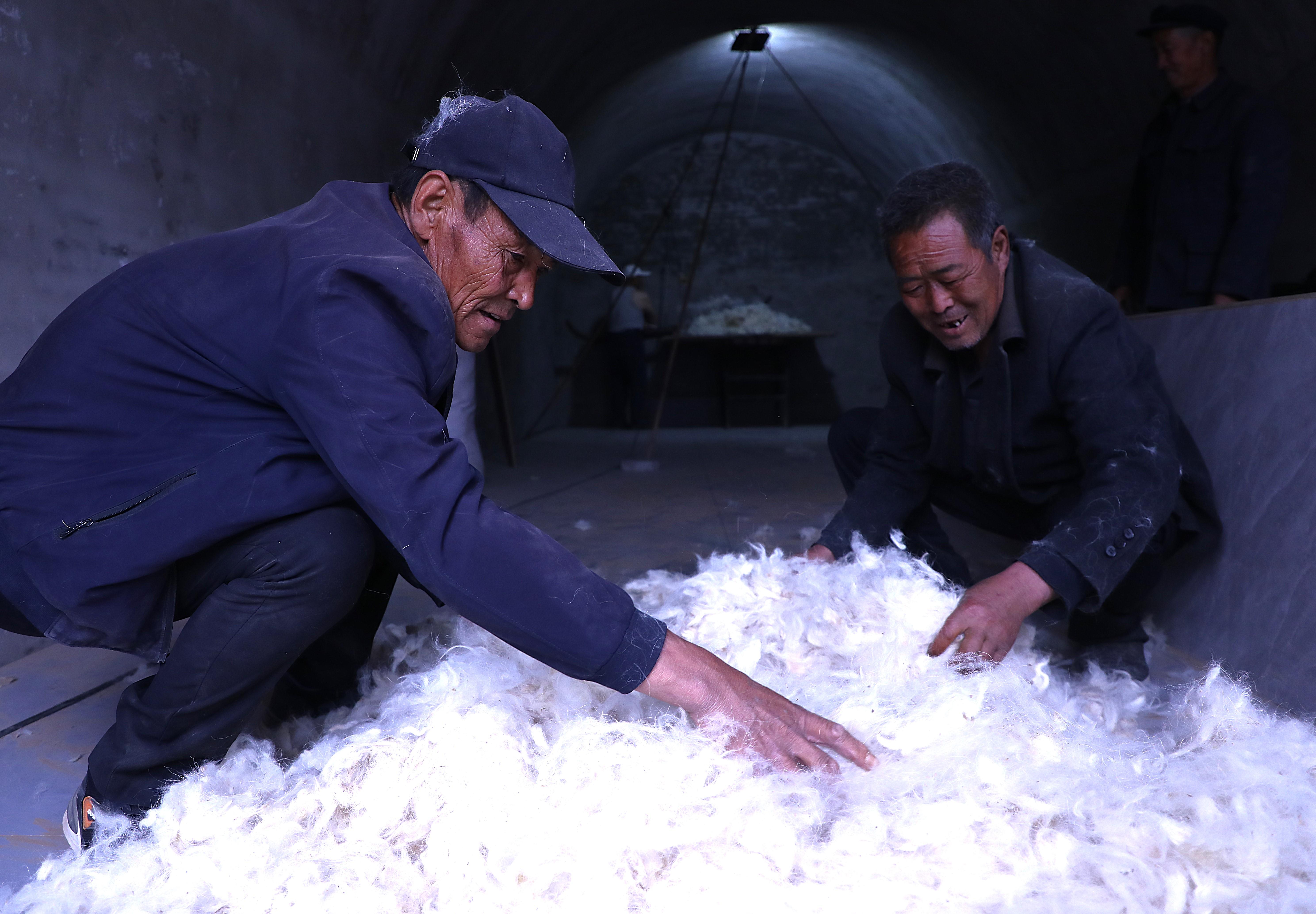 第一道工序是撿毛。匠人們把所需羊毛倒在平整的窯掌地上,幾人圍坐,仔細(xì)挑出里面的雜質(zhì)、羊糞。