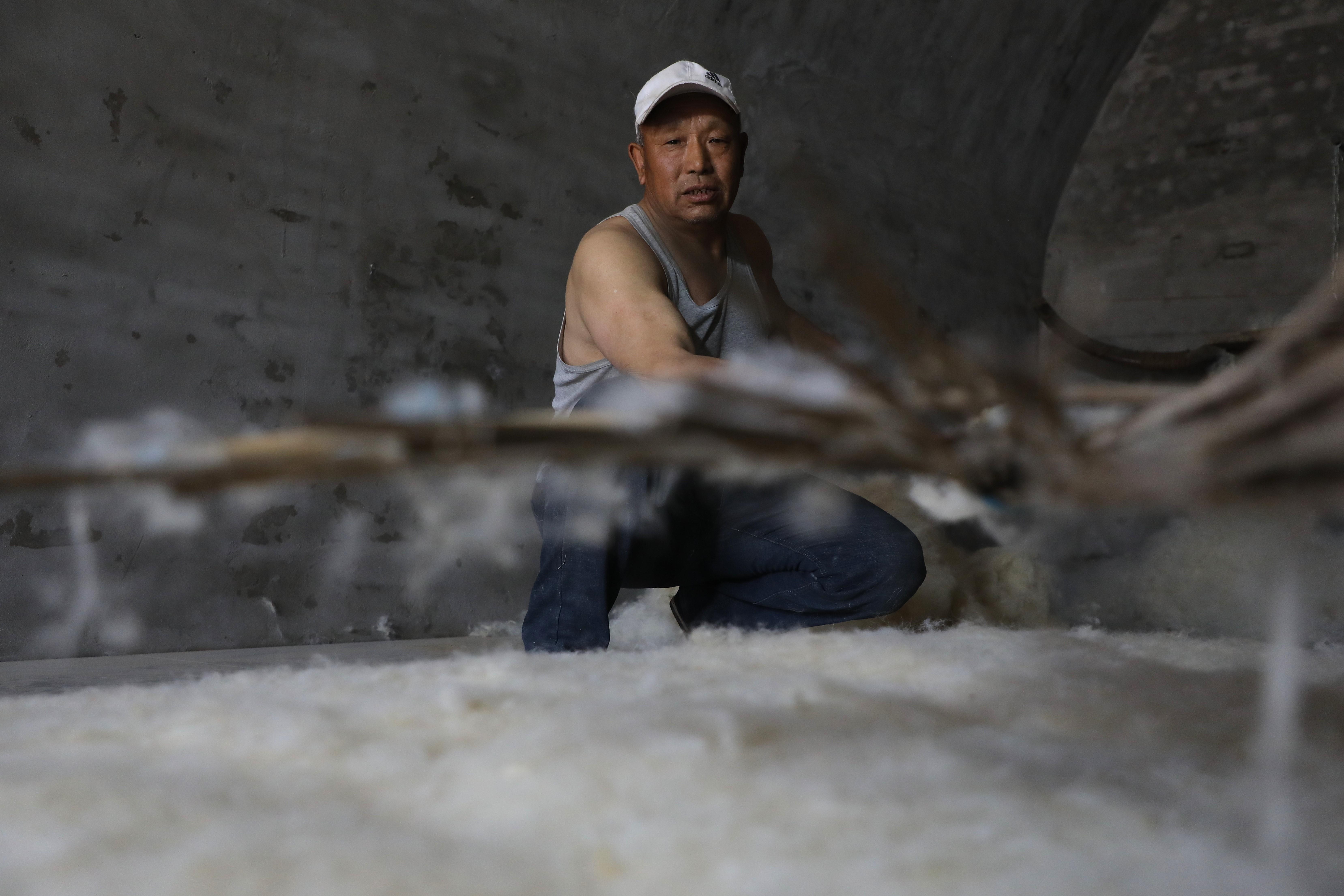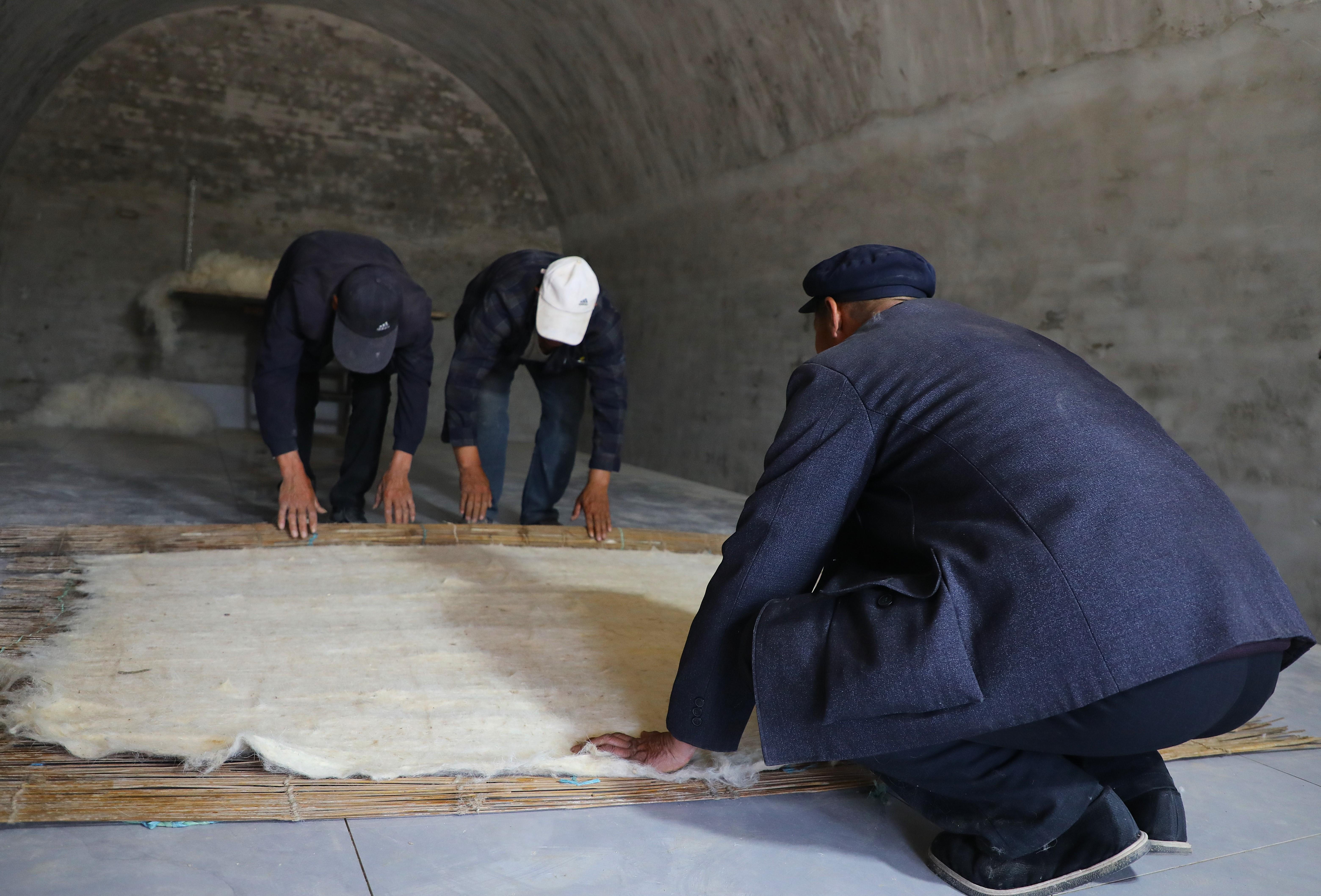 第三道工序是鋪毛,把白如棉絮的羊毛均勻鋪在提前備好的氈簾上。