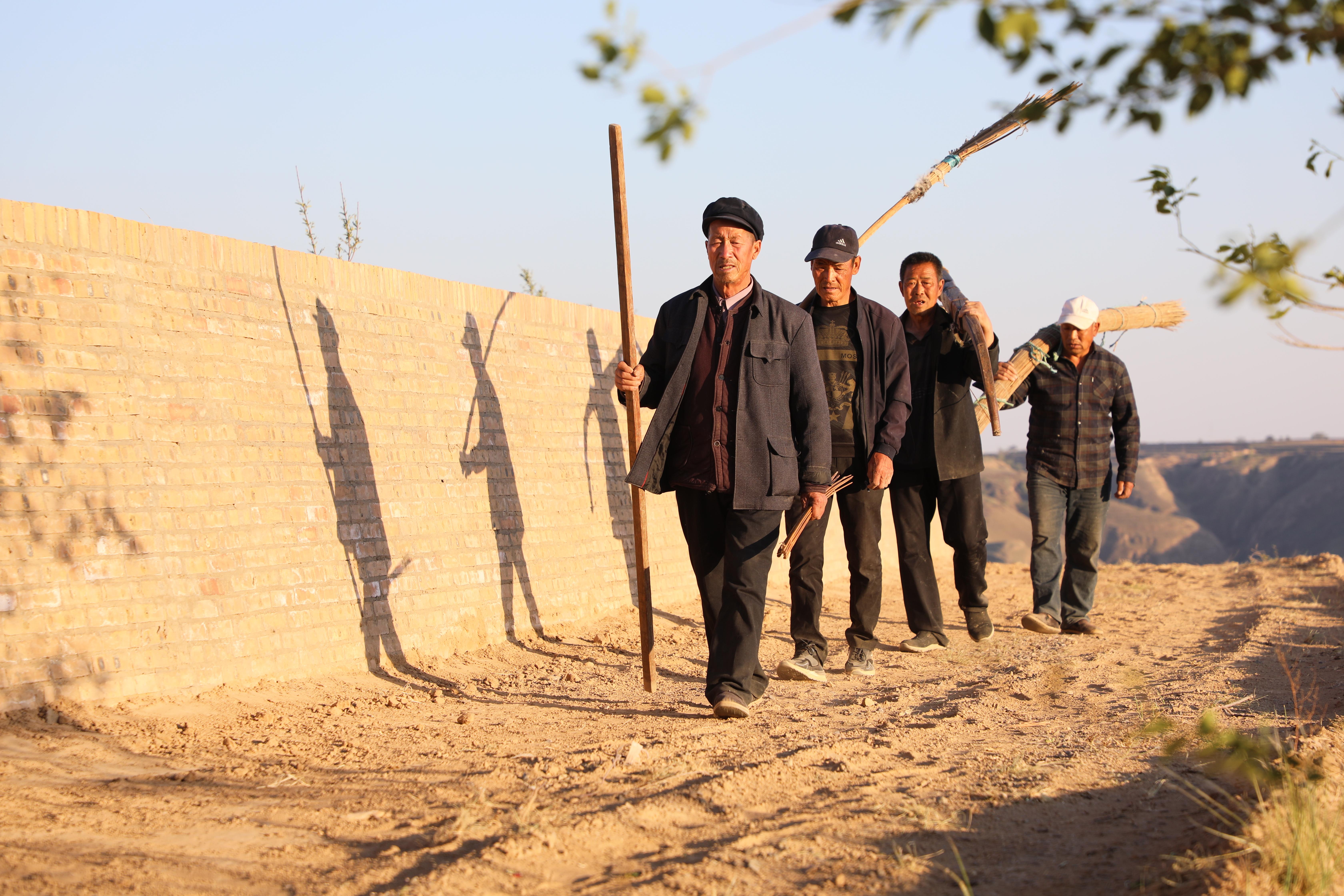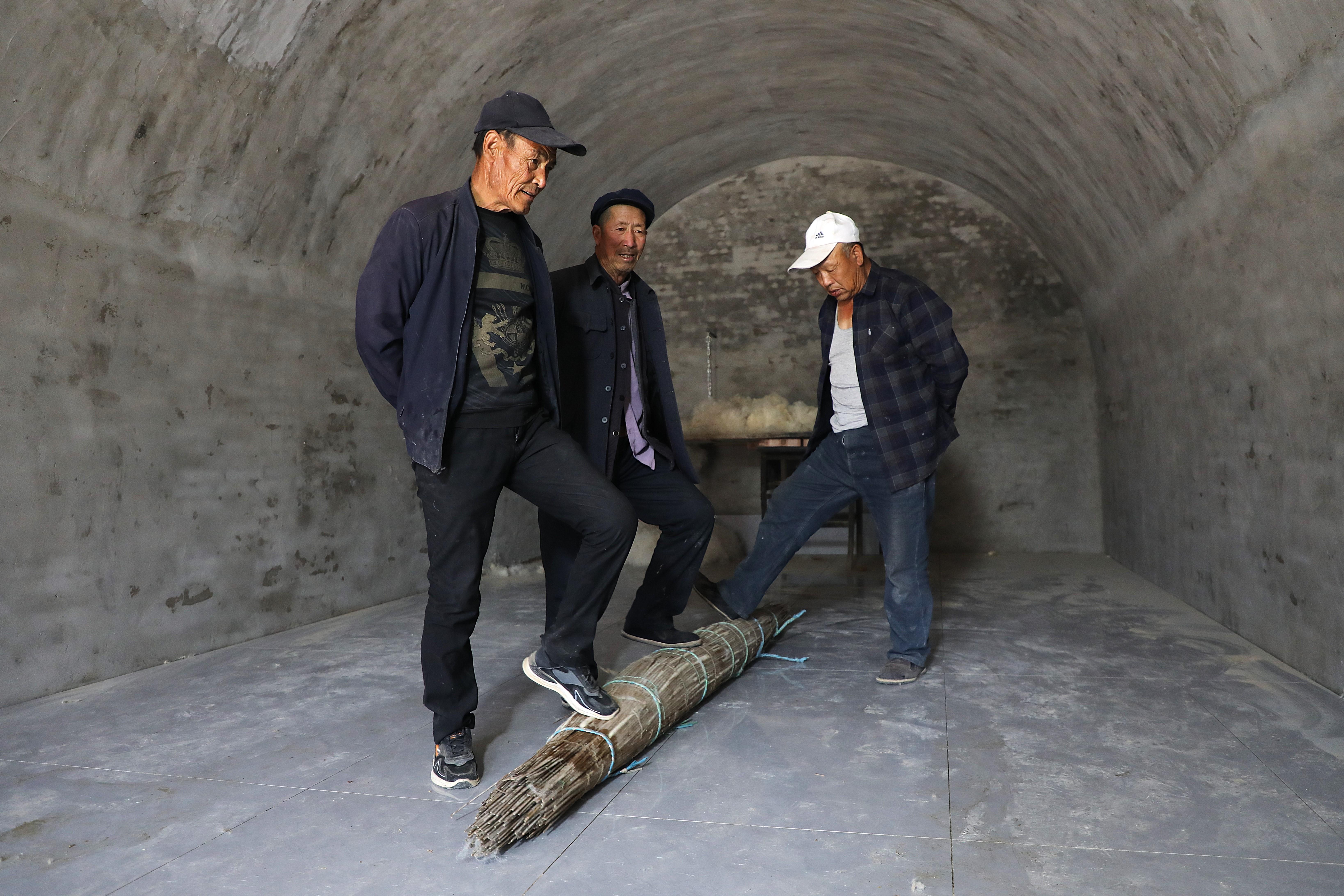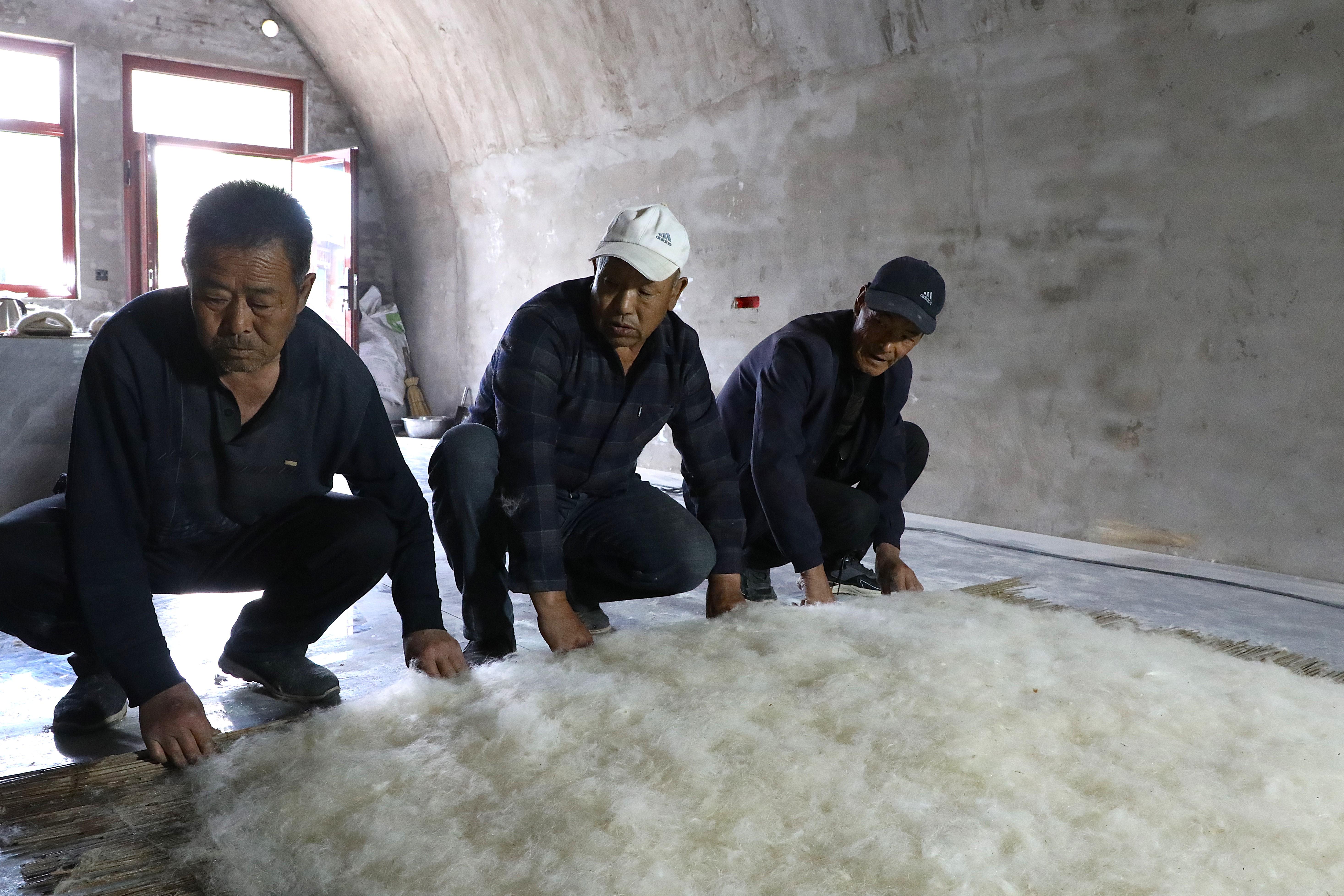 近日,應(yīng)環(huán)縣洪德鎮(zhèn)耿塬畔莊子峁負(fù)責(zé)人楊清艷邀請,薛占省帶領(lǐng)兩位堂弟徒弟—63歲的薛占紅和59歲的薛占義,以及本村另一位王姓老氈匠,重新拿起塵封已久的簾、弓、撣、絆、叉等簡單工具,來到莊子峁,再次展示這門古老的技藝。