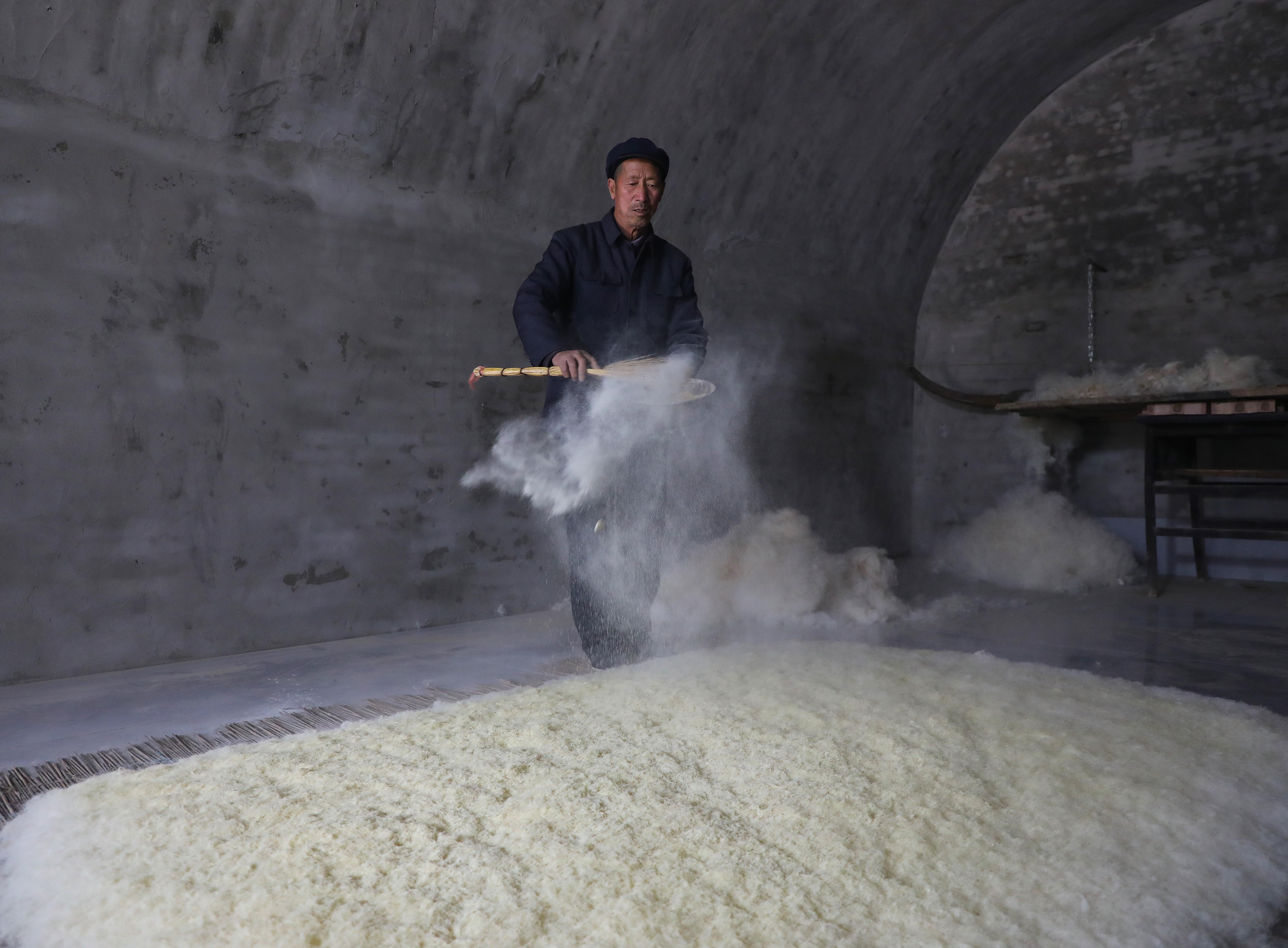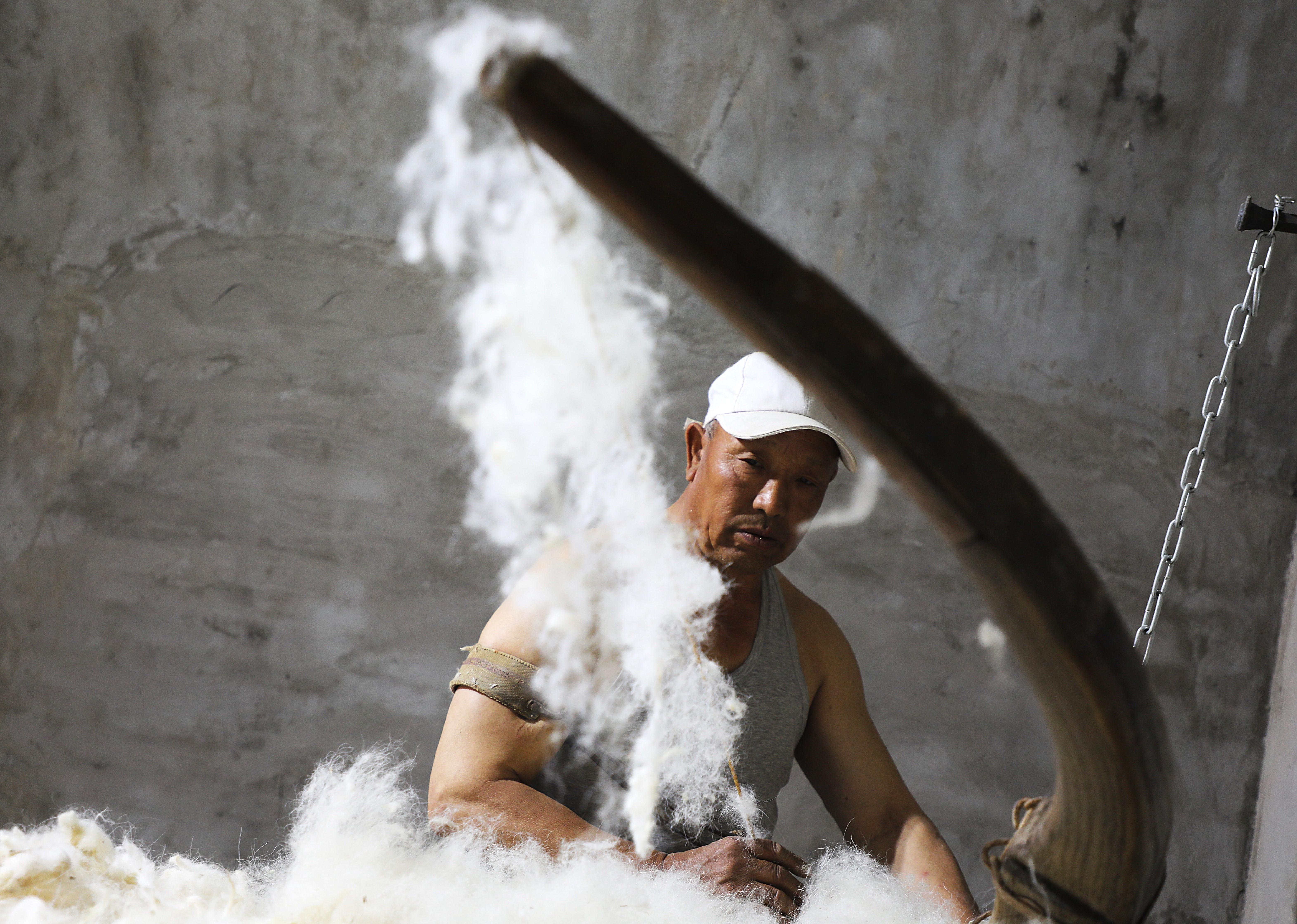 隨著弓弦顫動(dòng),“砰砰”聲中,羊毛如雪花般散開,變得蓬松輕盈。