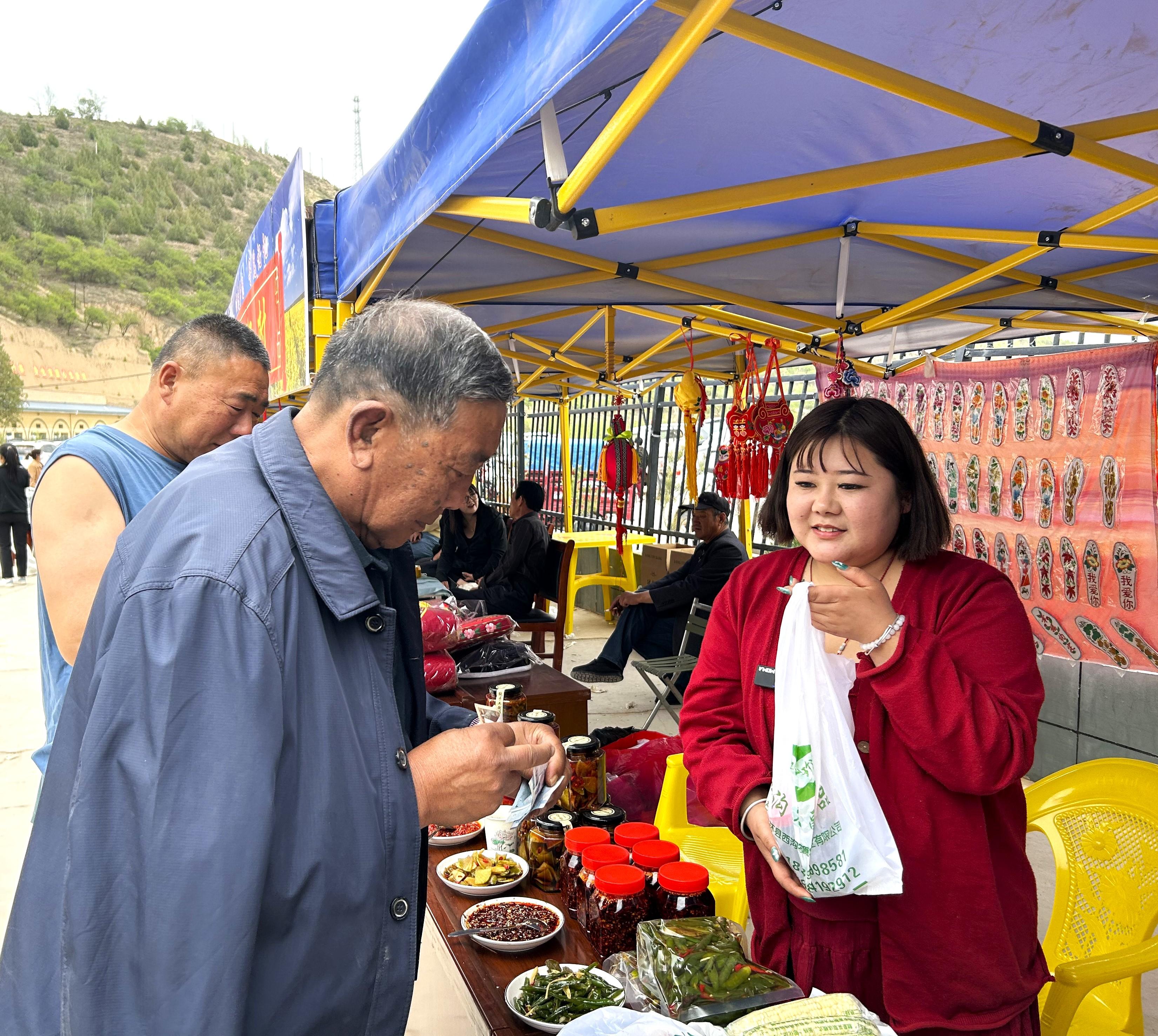 西溝村村支書劉小兵介紹道:“活動期間,我們集中展示村上和農(nóng)戶自家加工的農(nóng)產(chǎn)品,還把曲子鎮(zhèn)宋家塬村、樓房子村等15個兄弟村莊的農(nóng)產(chǎn)品、手工編織品一并展出,希望借此幫助更多農(nóng)戶增收?!蔽鳒洗宕迕裢趼虱傊谱鞯氖止び屠苯犯枪┎粦?yīng)求,早早售罄。她興奮地說:“早上剛加工好300瓶,一上午就賣光了,當(dāng)天收入2000多元。”