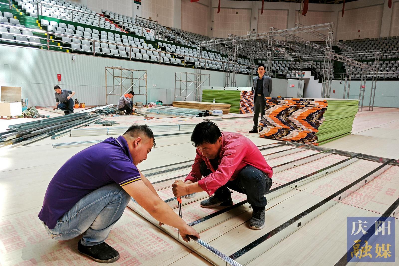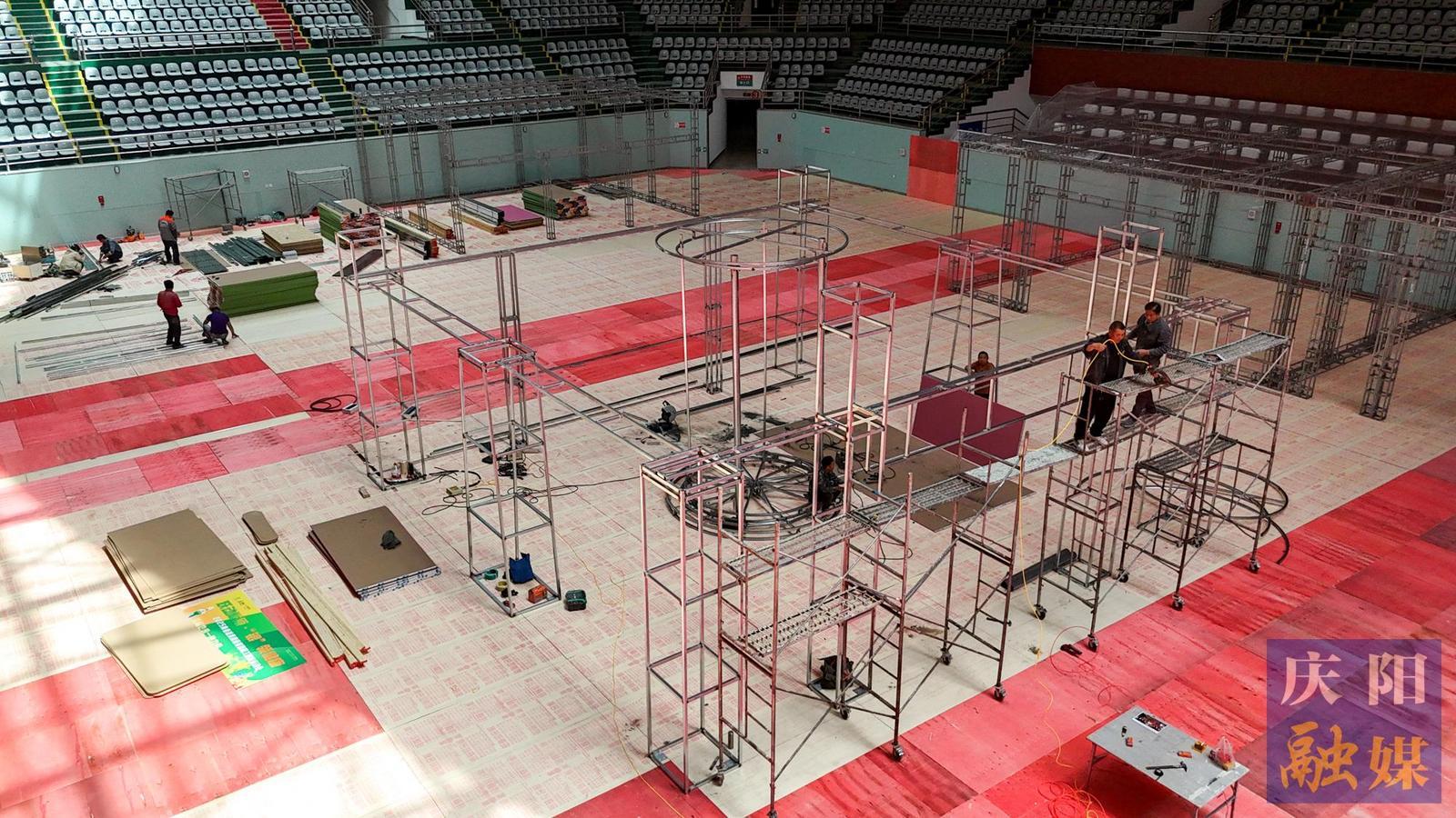 慶陽(yáng)體育館內(nèi),第二十屆慶陽(yáng)香包民俗文化節(jié)非遺展示主場(chǎng)館正在有序搭建。