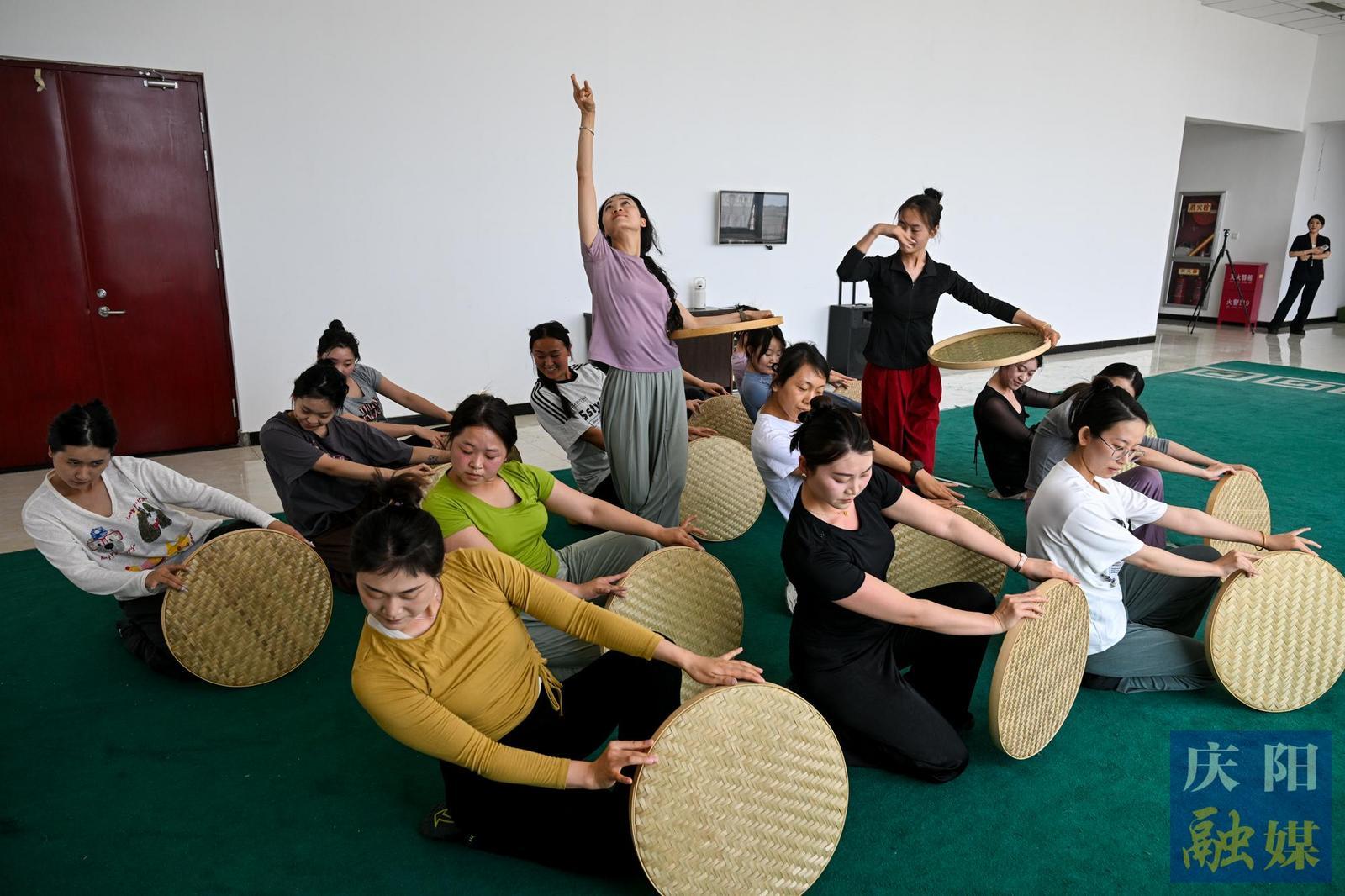 第二十屆慶陽(yáng)香包民俗文化節(jié)演職人員在慶陽(yáng)隴劇院排練舞蹈《能源新都 工業(yè)脊梁》。