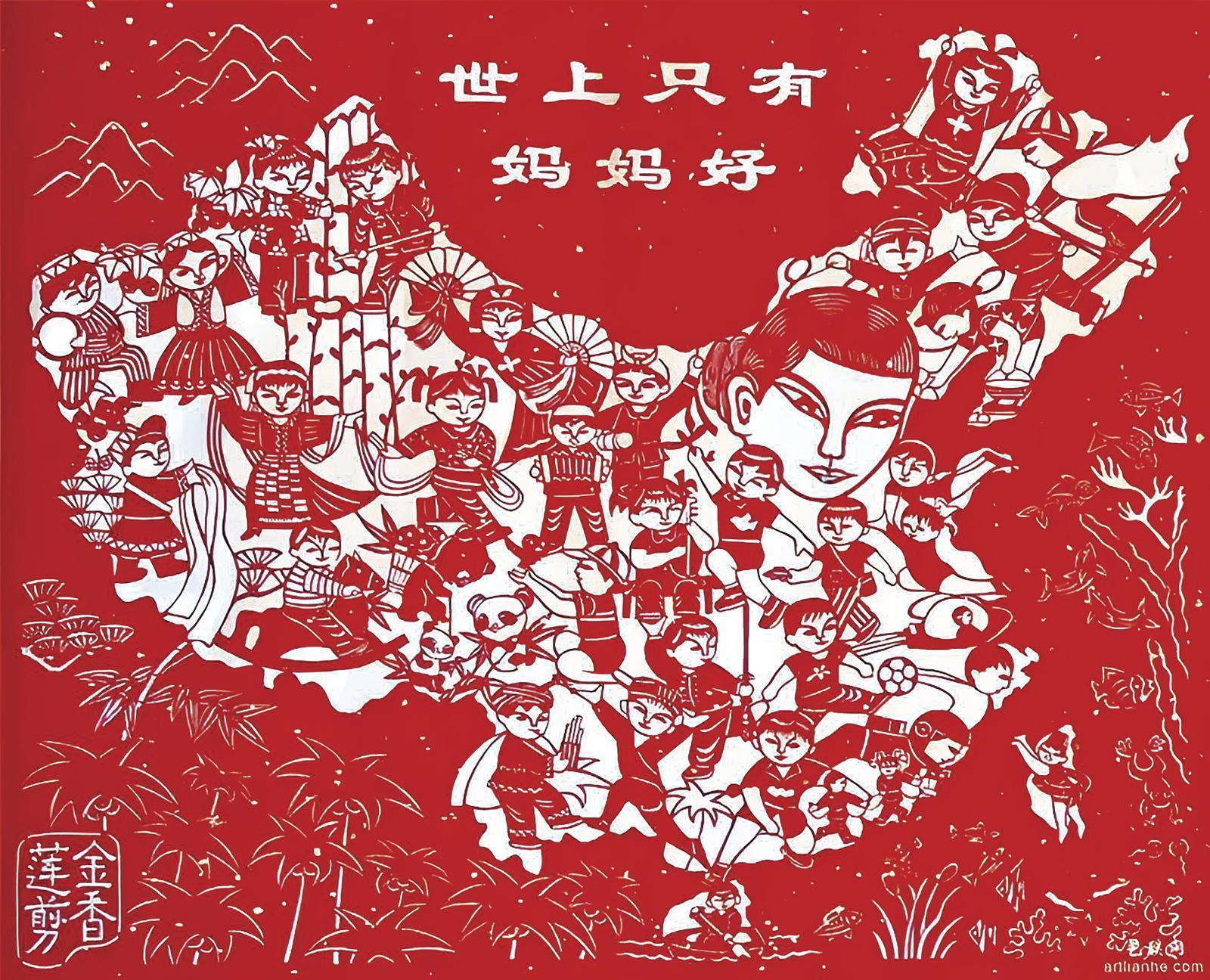 《世上只有媽媽好》剪紙作品由金香蓮創(chuàng)作,作品以中國地圖為輪廓,中心是一位頷首微笑的母親頭像,象征祖國母親,四周環(huán)繞34個身著民族服飾的孩子,代表中國各省級行政區(qū)。臺灣地區(qū)的圖案設(shè)計尤為巧妙——孩子雙手張開撲向母親懷抱,傳遞出兩岸血脈相連的深意?!妒郎现挥袐寢尯谩芬阅笎蹫橹黝},既是個人情感的抒發(fā),也是對慶陽剪紙傳統(tǒng)的致敬。