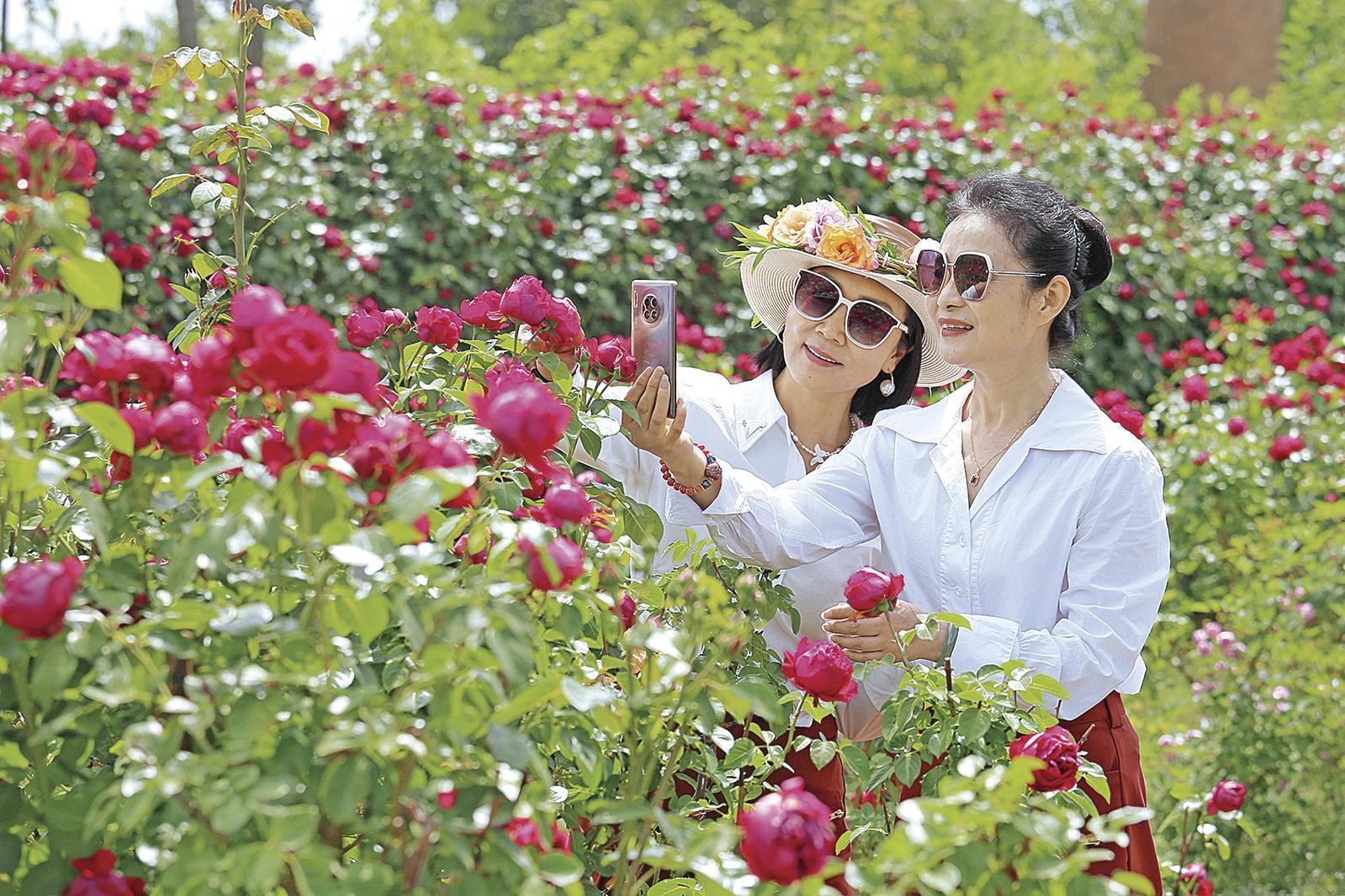 游客在溫泉鎮(zhèn)齊樓村凱鑫家庭農(nóng)場賞花拍照