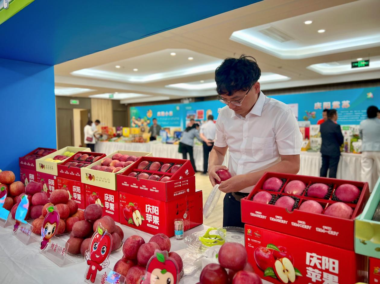 “這是我們慶陽的瑞雪蘋果,果肉脆甜多汁!”在寧縣金農(nóng)農(nóng)業(yè)扶貧開發(fā)有限公司的展位前,辦公室主任袁超斌正將切好的蘋果遞給采購商。展臺上,從經(jīng)典紅富士到新銳瑞雪、瑞陽,再到維納斯黃金等25個品種的蘋果整齊排列,色澤鮮亮、果香撲鼻。