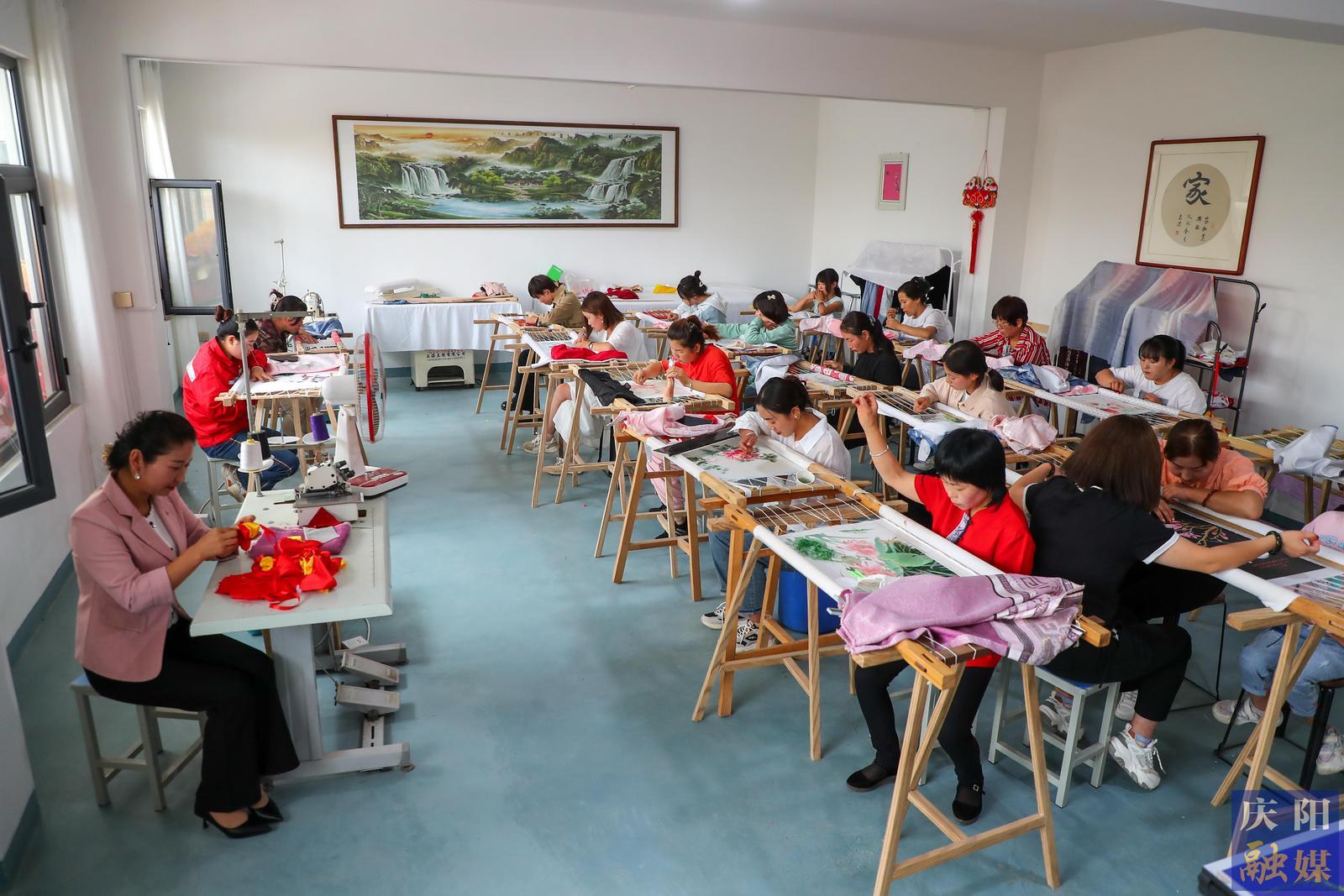 慶陽(yáng)紅世紀(jì)繡莊工藝品有限公司的刺繡工作間繡娘飛針走線,以線代墨,一幅幅精美的刺繡作品呼之欲出。 慶陽(yáng)融媒記者 陳飛 攝