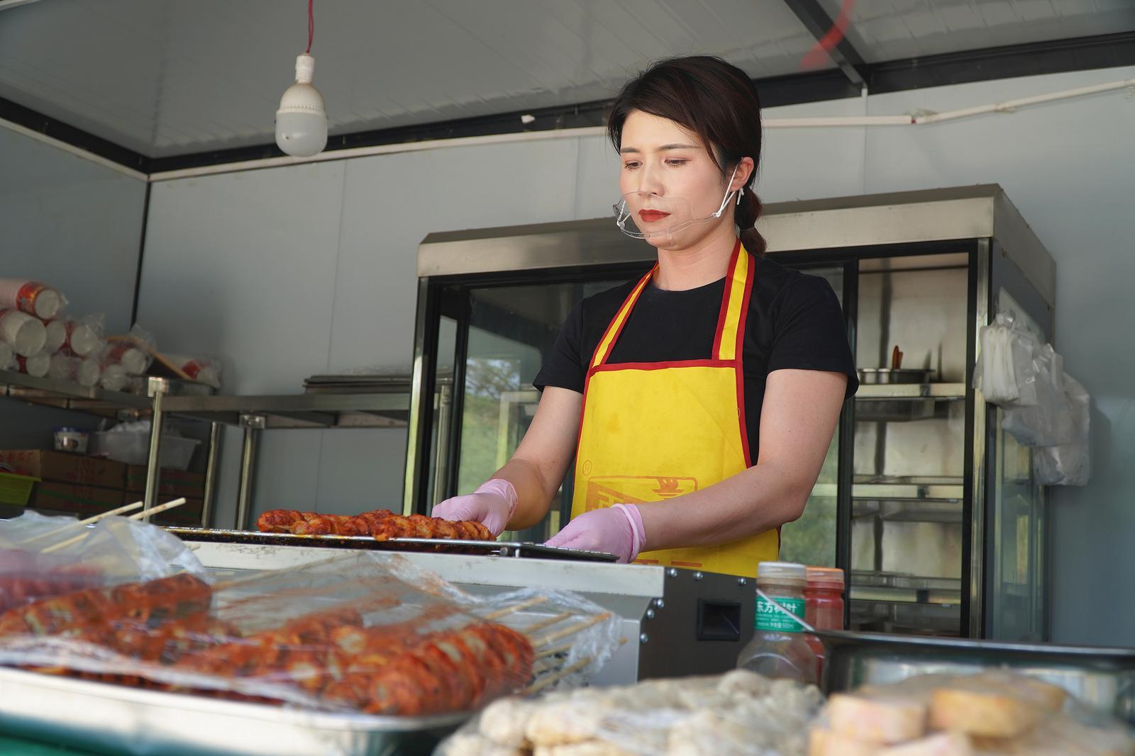 “這是您要的酸辣粉,多加了香菜?!笨荟┰诿朗硻n口忙得不亦樂乎。在這個18平方米空間內(nèi),烤面筋機(jī)、酸辣粉燙鍋、炸串臺分區(qū)有序??荟┦圪u烤面筋、酸辣粉、米線、炸串等小吃,憑借著干凈衛(wèi)生、口味地道,她的生意經(jīng)營得紅紅火火。