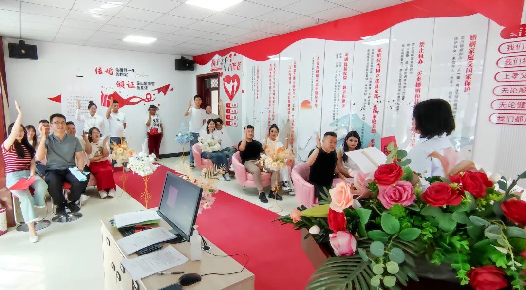 集體頒證儀式顯莊重、見溫情。以“印鑒初心嘉禮從簡(jiǎn)”為主題的“5·20”結(jié)婚登記集體頒證活動(dòng),將法律認(rèn)證與傳統(tǒng)禮儀融合,詢問新人結(jié)婚意愿、告知領(lǐng)取結(jié)婚證的法律意義、集體宣讀結(jié)婚誓詞、頒發(fā)結(jié)婚證等環(huán)節(jié)強(qiáng)化婚姻神圣感,57對(duì)新人用實(shí)際行動(dòng)踐行“重登記 輕儀式”新風(fēng)尚。