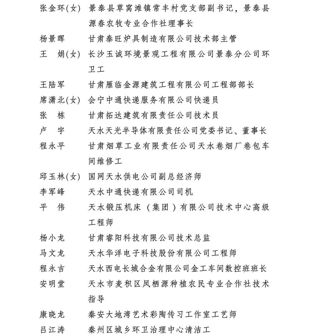 為表彰先進典型、凝聚奮進力量,激勵引導(dǎo)全省人民奮進新征程、再創(chuàng)新業(yè)績,省委、省政府決定授予王玉等219人甘肅省勞動模范稱號,授予馬蘭紅等79人甘肅省先進工作者稱號。希望獲得表彰的同志,珍惜榮譽、永葆本色,堅韌不拔、再立新功,充分發(fā)揮模范帶頭作用,激勵全省廣大職工群眾踴躍投身到推動甘肅發(fā)展、造福隴原人民的火熱實踐。