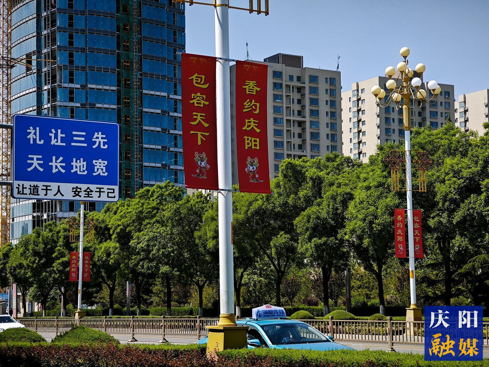 西峰區(qū)岐黃大道兩側(cè)節(jié)會主題道旗整齊排列。